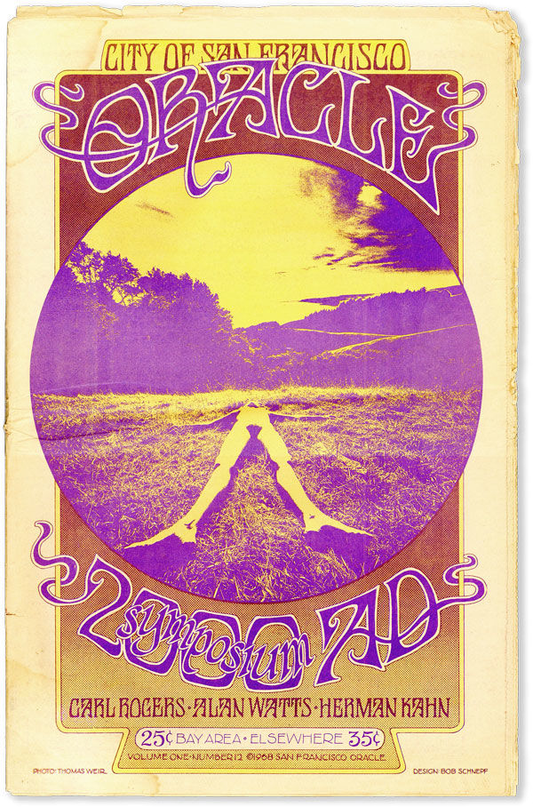 San Francisco: San Francisco Oracle, 1968. First Edition. Tabloid (44cm); pictorial newsprint wrappers; 32pp; illus. Horizontal fold at center, some wear, handling, and faint creasing to extremities, with a few old, faint dampstains at upper and lower spine-fold; Very Good, complete copy. Final issue of this legendary Bay Area psychedelic paper, with contributions by George Leonard, Michael Murphy, Carl Rogers, Philip Whalen, Daniel Moore, Lew Welch, Alan Watts, and others, with an attractive mandala centerfold.