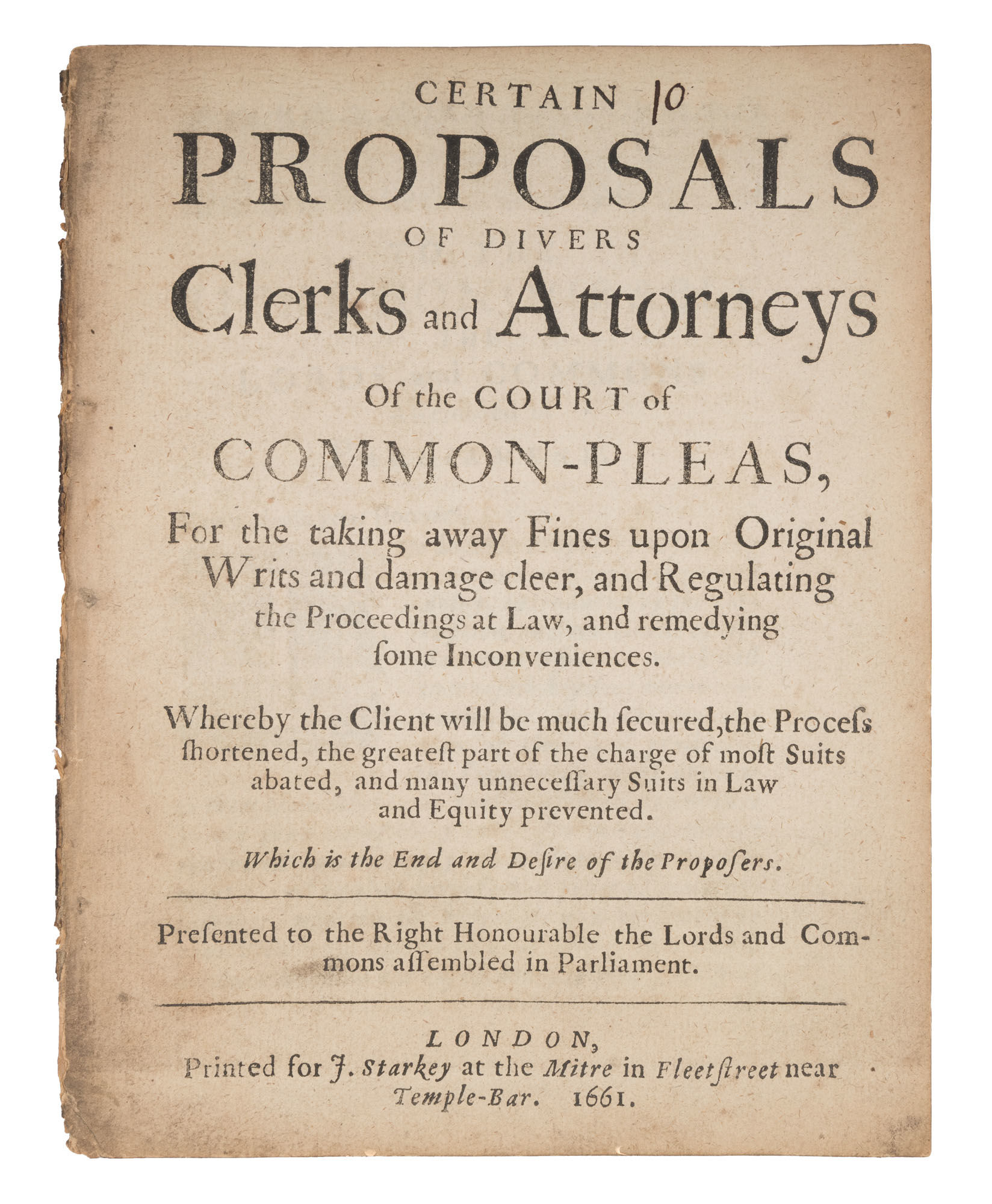 1661. A Scarce Restoration-Era Pamphlet Proposing Reforms to Court Procedure [Law Reform]. [Great Britain]. Certain Proposals of Divers Clerks and Attorneys of the Court of Common-Pleas, For the Taking Away Fines upon Original Writs and Damage Cleer, And Regulating the Proceedings at Law, And Remedying Some Inconveniences. Whereby the Client Will be Much Secured, The Process Shortened, The Greatest Part of the Charge of Most Suits Abated, And Many Unnecessary Suits in Law and Equity Prevented. Which is the End and Desire of the Proposers. Presented to the Right Honourable the Lords and Commons Assembled in Parliament. London: Printed for J. Starkey at the Mitre in Fleetstreet near Temple-Bar, 1661. [vi], 8 pp. Quarto (7" x 5-1/2"). Disbound stab-stitched pamphlet. Moderate toning, soiling to exterior, light browning to margins, "10" in early hand to head of title page. $450. * Only edition. Produced by a "divers" group of "clerks and attorneys of the Court of Common-Pleas," this pamphlet suggests ways to reform pleading and procedure, and reduce the number of lawsuits, in the civil and equity courts. This is a scarce title. OCLC locates 6 copies, 4 in law libraries (Harvard, Library of Congress, San Francisco Law Library, Yale). English Short-Title Catalogue R35481.