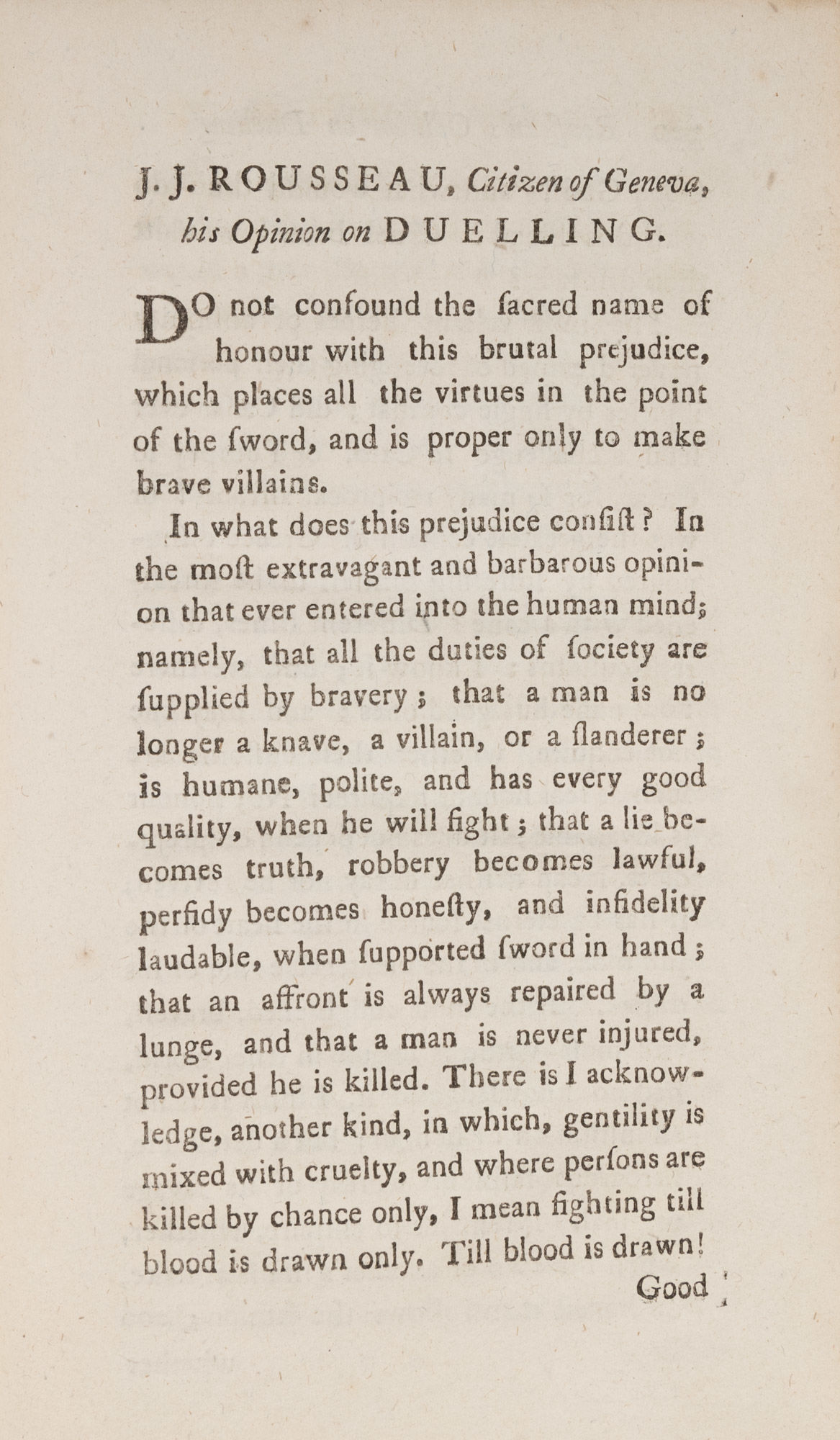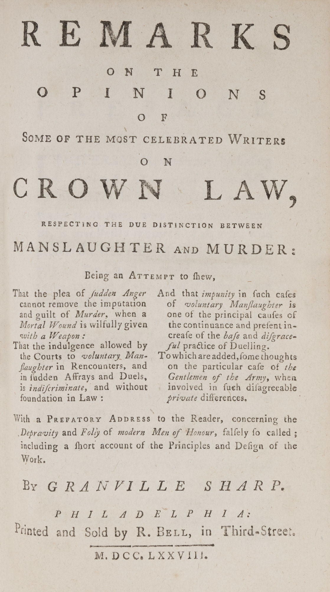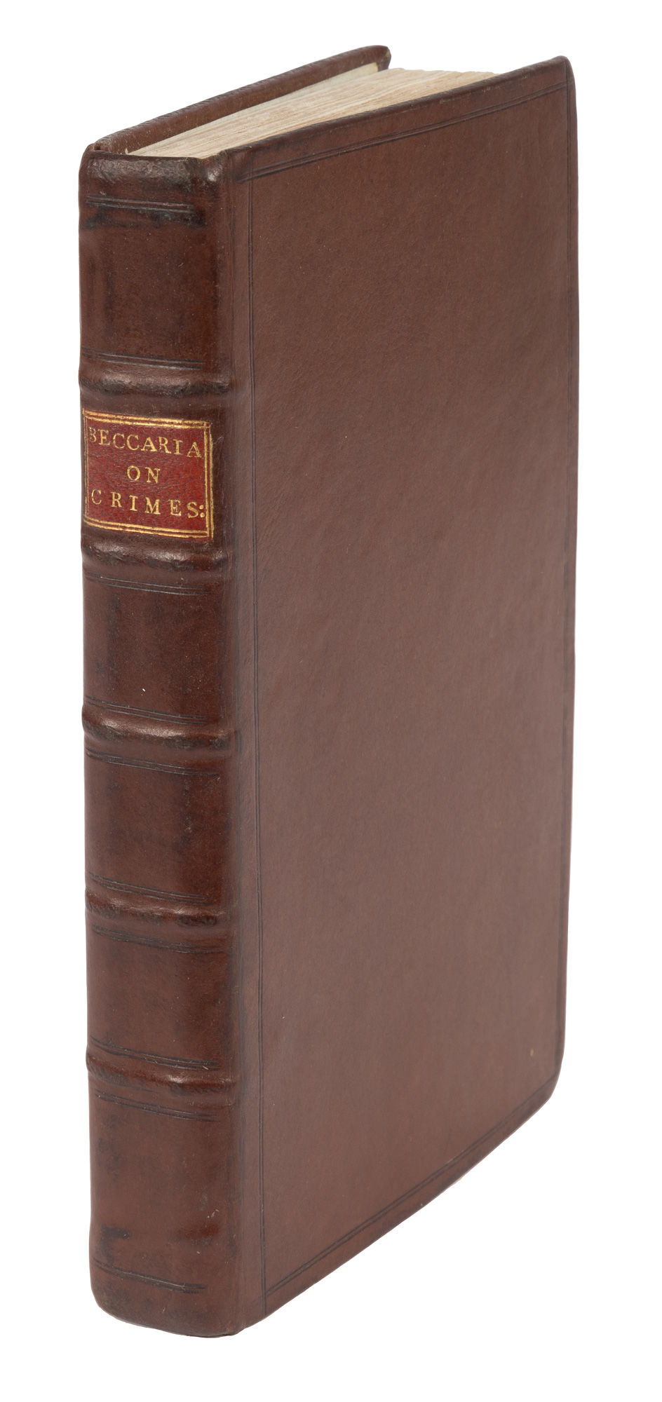 1778. Philadelphia: Printed by R. Bell, 1778.. Philadelphia: Printed by R. Bell, 1778. Early American Edition of Beccaria in an Exceptional Period-Style Binding Beccaria, [Cesare Bonesana, Marchese di] [1738-1794]. Voltaire [Arouet, Francois-Marie] [1694-1778]. Sharpe, Granville [1735-1813]. Rousseau, Jean-Jacques [1712-1778]. An Essay on Crimes and Punishments. Written by the Marquis Beccaria of Milan. With a Commentary Attributed to Monsieur De Voltaire. Philadelphia: Printed by R. Bell, 1778. [iv], 352, [4] pp. Includes one-page publisher list. Three works in one with continuous pagination. The second work, preceded by a half-title and title page is Sharpe's Remarks on the Opinions of Some of the Most Celebrated Writers on Crown Law, Respecting the Due Distinction Between Manslaughter and Murder, the third, with a drop-head title, is J.J. Rousseau, Citizen of Geneva, His Opinion on Duelling. Octavo (7-1/2" x 4-1/2"; 19 x 11.45 cm). Superb period-style calf by Philip Dusel, blind rules to boards, raised bands and lettering piece to spine, endpapers renewed, upper corner and chip to foot of title page restored, leaves washed. Light toning, slightly heavier in places, faint spotting to a few leaves. An exceptional copy. $3,500. * With a table of authorities and cases. Dei Delitti e Delle Pene (1764) was the first systematic study of the principles of crime and punishment. Infused with the spirit of the Enlightenment, its advocacy of crime prevention and the abolition of torture and capital punishment marked a significant advance in criminological thought, which had changed little since the medieval era. It had a profound influence on the development of criminal law. It was especially influential among American thinkers, who saw Beccaria as a source of enlightened ideas to reform English common law. Though the date of the true first edition has been debated, it is clear today that the first American edition was published in Charleston, SC, in 1777. What appeared to be earlier American imprints, including a 1773 New York imprint, have been ascertained to be ghosts. Cohen, Bibliography of Early American Law 4233.