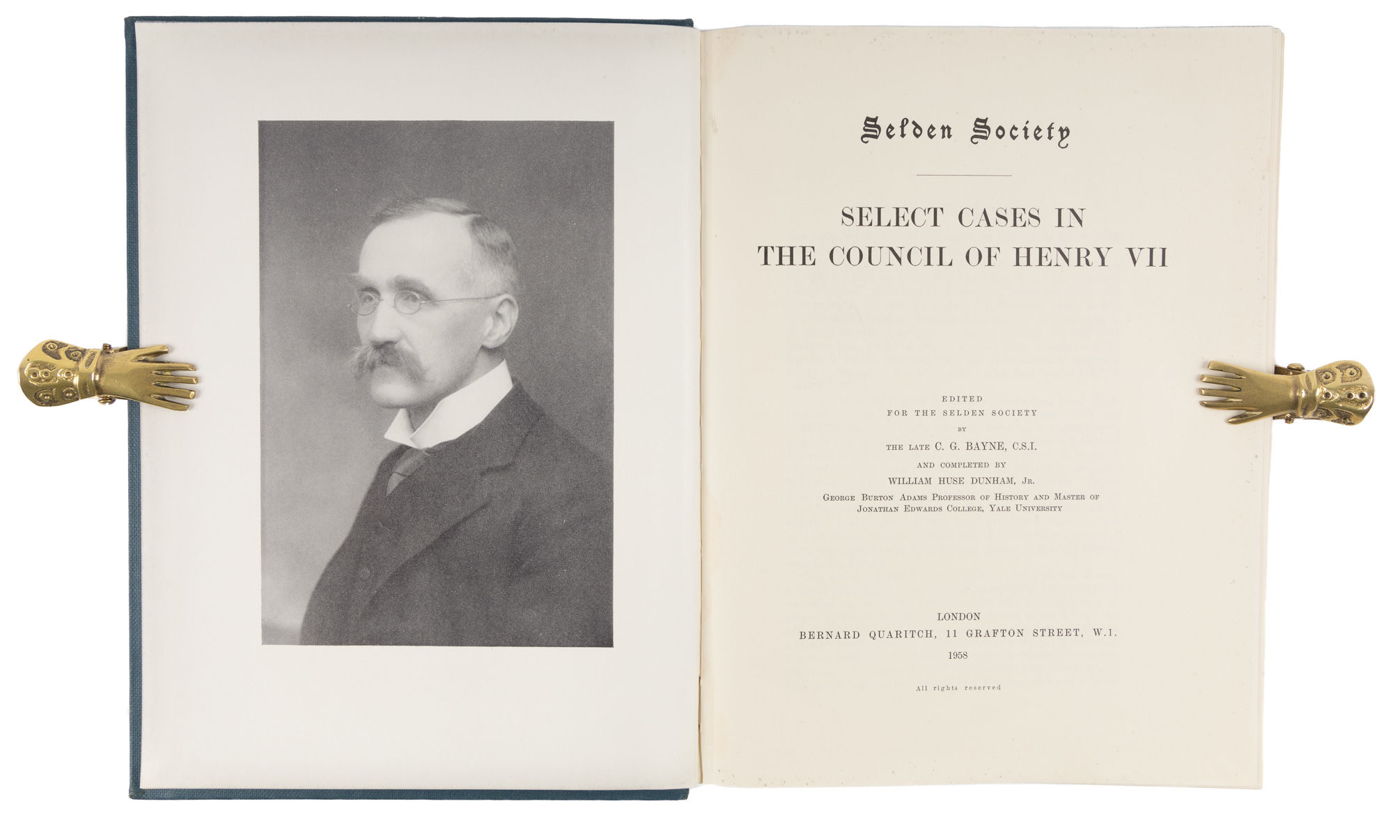 1958. Bayne, C.G. and William Huse Dunham (Editors). Select Cases in The Council of Henry VII. The Publications of the Selden Society Series, volume 75 for 1956. London: Bernard Quaritch, 1958. clxxiv, 197 pp. Frontispiece. Hardcover, publisher's blue cloth. Ex-library with shelf location label at foot of spine and property stamps. Light wear. Good. $20.
