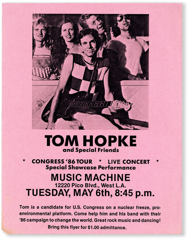 Relic of the short-lived political career of Los Angeles singer-songwriter Tom Hopke, who ran in California's 23rd District, encompassing portions of Los Angeles and Kern Counties, on the Peace and Freedom Party ticket. Hopke campaigned under the Peace and Freedom banner even though "we don't really agree on a lot of issues – it was just easier to get on the ballot with them" [see L.A. Times, "This Politico Can Write His Own Campaign Song," April 20, 1986]. A Buddhist astrologer who described his musical style as "similar to Tom Petty or John Cougar Mellencamp," Hopke ran on a platform that combined bread-and-butter left-wing talking points, including nuclear disarmament and redistribution of land and property, with some views that would not have played well within his chosen party affiliation, including opposing abortion and favoring capital punishment. The 1986 election was won overwhelmingly by incumbent Anthony Beilenson; Hopke received 1.4% of the vote.