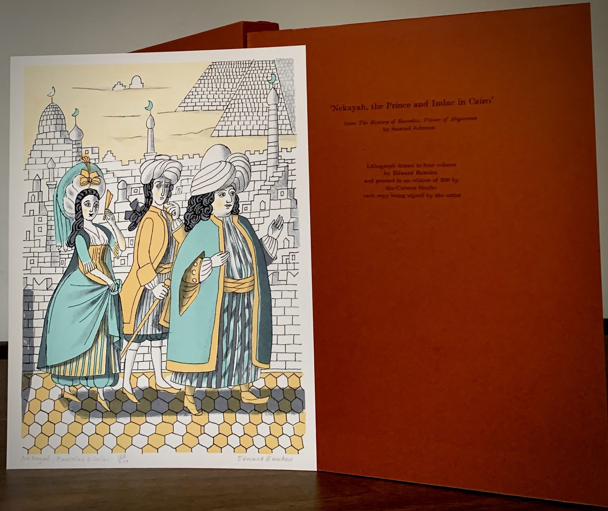 Godalming, Surrey: Pendomer Press, 1979. First edition. Hardcover. Orig. quarter black morocco and decorated boards. Teg. Fine in fine brown slipcase containing the original lithograph housed in matching brown lettered portfolio. 200 pages. 29.5 x 21 cm. Limited edition, copy 138 of 200, printed and bound by the Scolar Press on Glastonbury Book Antique Laid 120 gm paper. Bibliography by Barry McKay. This special edition with an original four-color lithograph "Nekayah," the Prince and Imlac in Cairo laid-in and signed by Bawden. There are eleven color plate and a host of black and white illustrations. During W.W.II he served as a war artist where he befriended Edward Ardizzioni. An almost as new copy.
