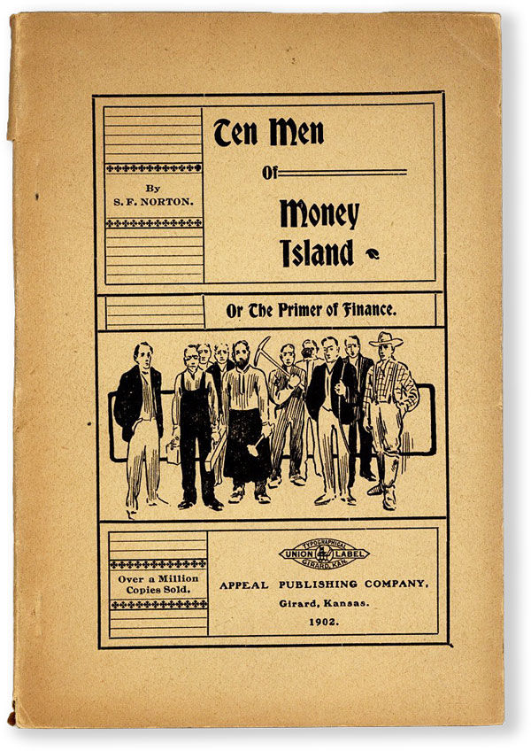 Girard, KS: Appeal Publishing Company, 1902. Revised Edition. Octavo (18.75cm); original pictorial wrappers; [5],6-96pp; illus. Light wear and toning to spine and wrapper extremities, with shallow loss to base of spine, a short split to upper spine, and some faint creasing to upper right corners; Very Good. A tax reform utopia, originally published serially in the Chicago Sentinel between 1879 and 1885, and subsequently in pamphlet format by Norton in 1892, which sold over a hundred thousand copies. Ten Men of Money Island was variously reprinted, even as late as 1930, including editions by Wayland's Appeal to Reason, the London utopian publisher Reeves, and the Chicago publisher F.J. Schulte. SARGENT p.45 (citing only the London ed.). Not in Negley or Lewis, and not found in Wright.
