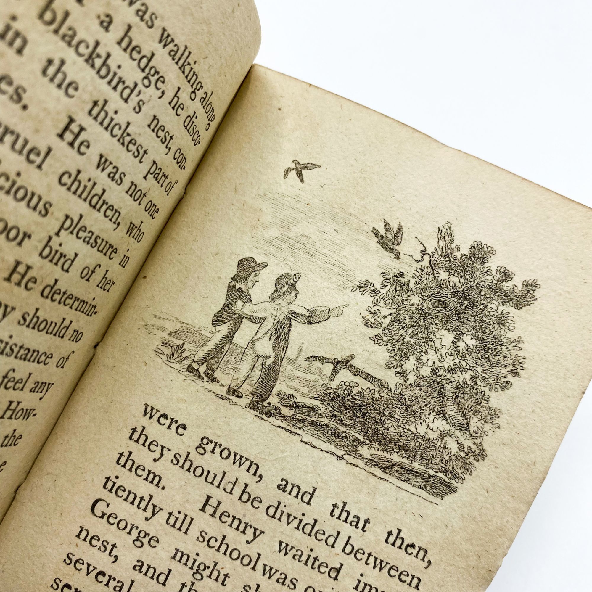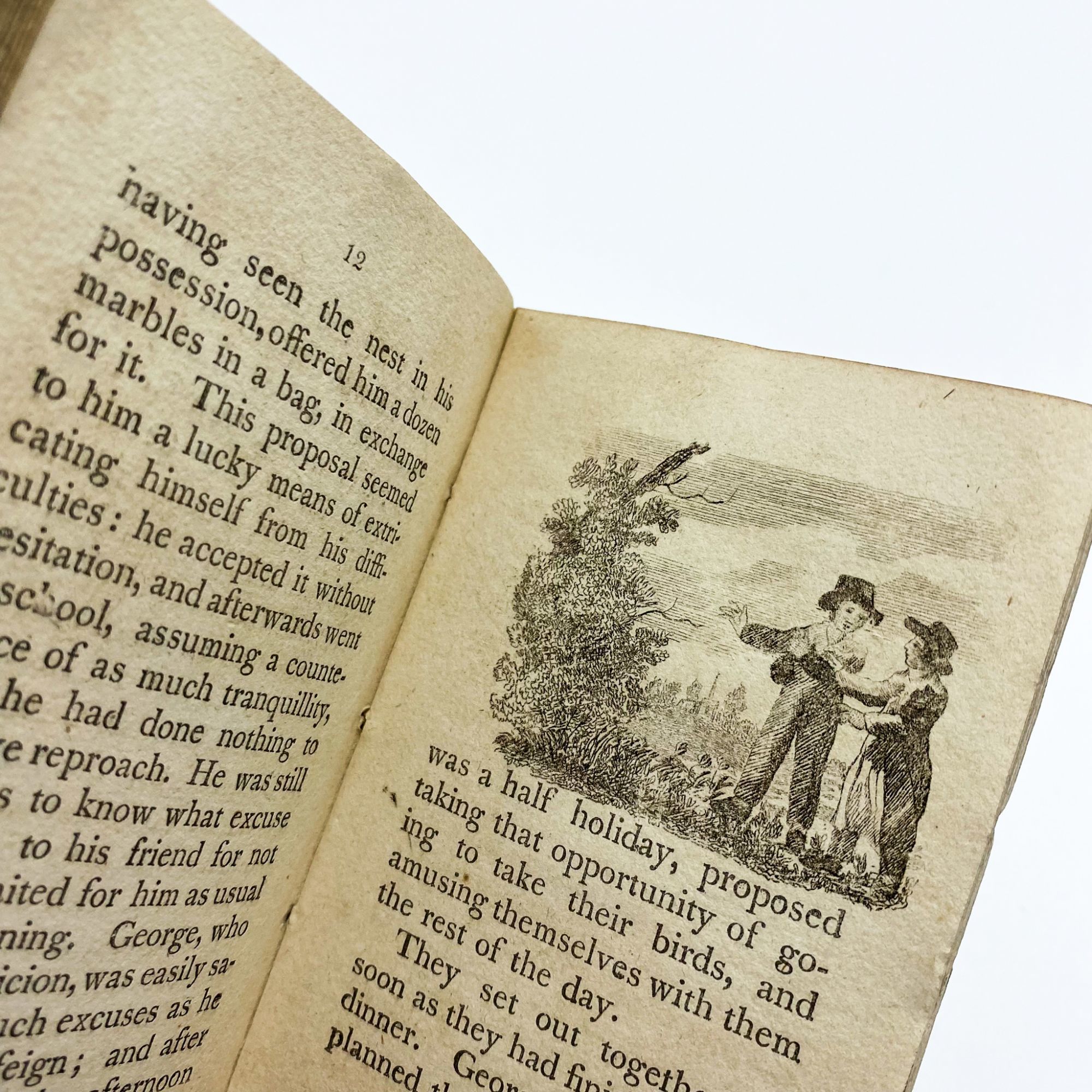 Philadelphia: Johnson & Warner, 1812. Very good.. First edition of this Philadelphia-printed Early Republic tale of how friendship is tested by dishonesty, with delicate wood-engraved illustrations. This publication is distinguished for its elegant and evocative wood engravings, which depicted a variety of scenes in the life of two young boys. OCLC locates only two copies, with an additional copy at the Met. 5'' x 3.25''. Original stiff black-and-white pictorial wrappers, saddle-stitched. 11 black-and-white engavings. 36 pages. Some patches of loss to front design and spine of wrapper; a bit of edgewear and bumping. Light soiling to a few leaves at the beginning and ending. Sound and tight.