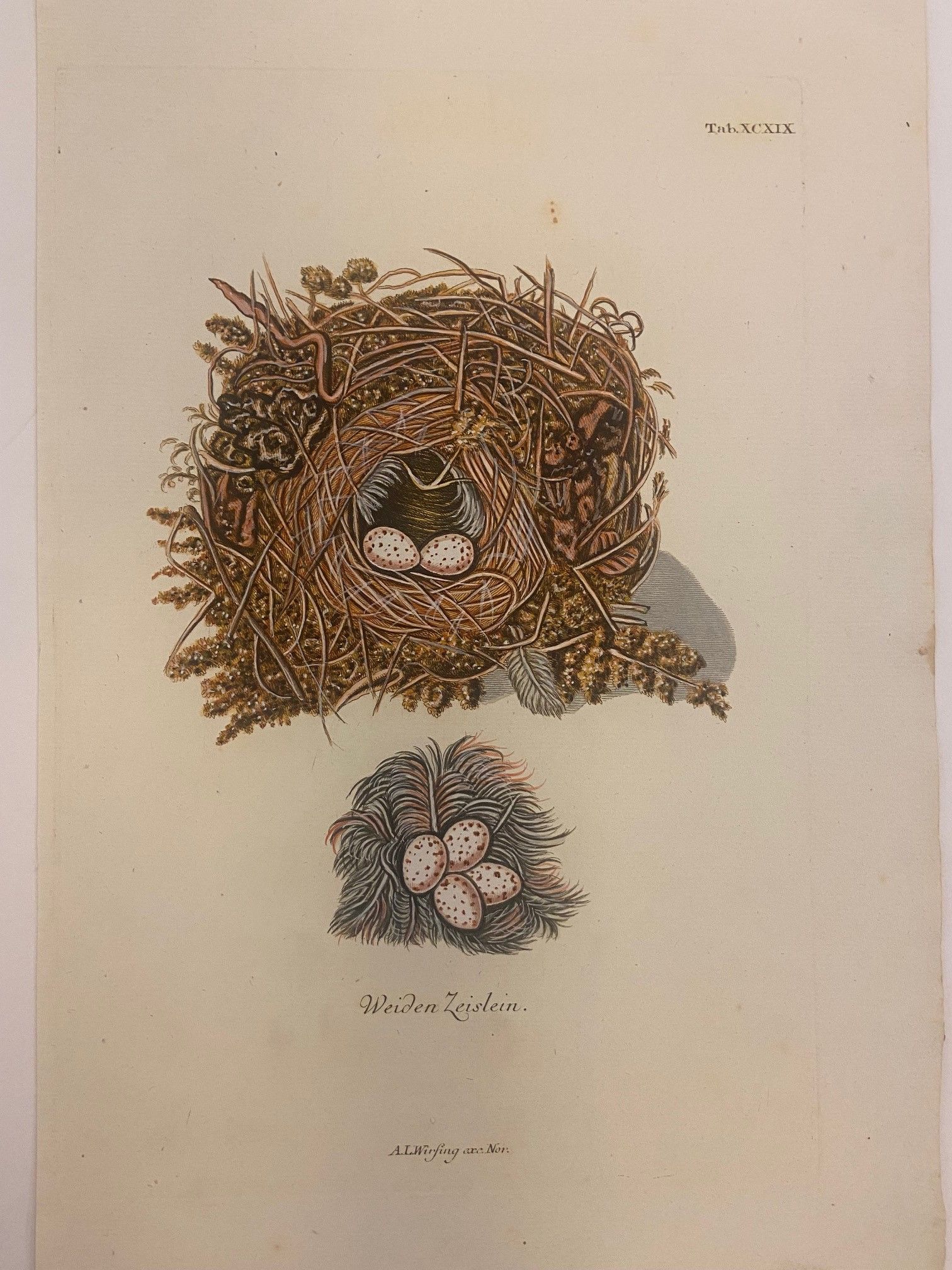 This beautiful 18th century engraving depicts a Eurasian siskin's nest.