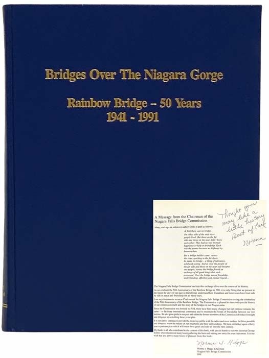 Niagara Falls: Niagara Falls Bridge Commission, 1991. Signed Copy. Large Hardcover. Near Fine/No Jacket. 8x5x0. Signed by author. Signed by Niagara Falls Bridge Commission Chairman, Norma I. Higgs, who contributed foreword, with inscription, "Thought you may like a little history. Best of luck." Lacks jacket. A few pages very lightly dog-eared. 1991 Large Hardcover. xi, 257 pp. Color and black-and-white reproductions of photographs and illustrations throughout. Includes: Bridges at the Whirlpool Rapids: Niagara Suspension Bridge, Railway Suspension Bridge, Niagara Railway Arch Bridge, Whirlpool Rapids Bridge, Railway Cantilever Bridge, Michigan Central Railway Arch Bridge; Brides at Lewiston-Queenston: Lewiston-Queenston Suspension Bridge, Lewiston-Queenston Arch Bridge; Bridges at the Falls: Upper Suspension Bridges, Upper Steel Arch Bridge, Rainbow Bridge, Rainbow Tower Carillon; Members of the Niagara Falls Bridge Commission; Bibliography; Notes; Chronology; Index.