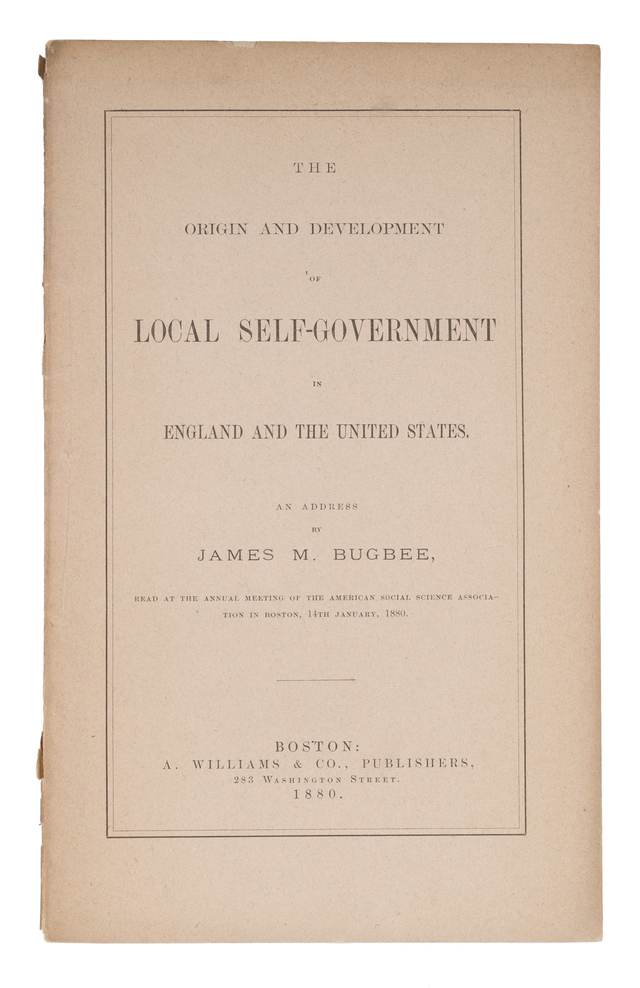 1880. Boston: A. Williams & Co., Publishers, 1880. 39 pp. Boston: A. Williams & Co., Publishers, 1880. 39 pp. By an Early Expert on Municipal Government Bugbee, James M. [1837-1913]. The Origin and Development of Local Self-Government in England and the United States. Boston: A. Williams & Co., Publishers, 1880. 39, [1] pp. Octavo (8-1/4" x 5-1/4"). Stab-stitched pamphlet in printed wrappers. Some wear to spine ends, small chip to top-edge of rear wrapper, moderate toning to interior. $150. * Only edition. This essay, the published version of an address to the American Social Science Association, considers the role of municipal corporations in the development of self-government. Bugbee was an early expert on municipal government. His best-known work is The City Government of Boston (1887).