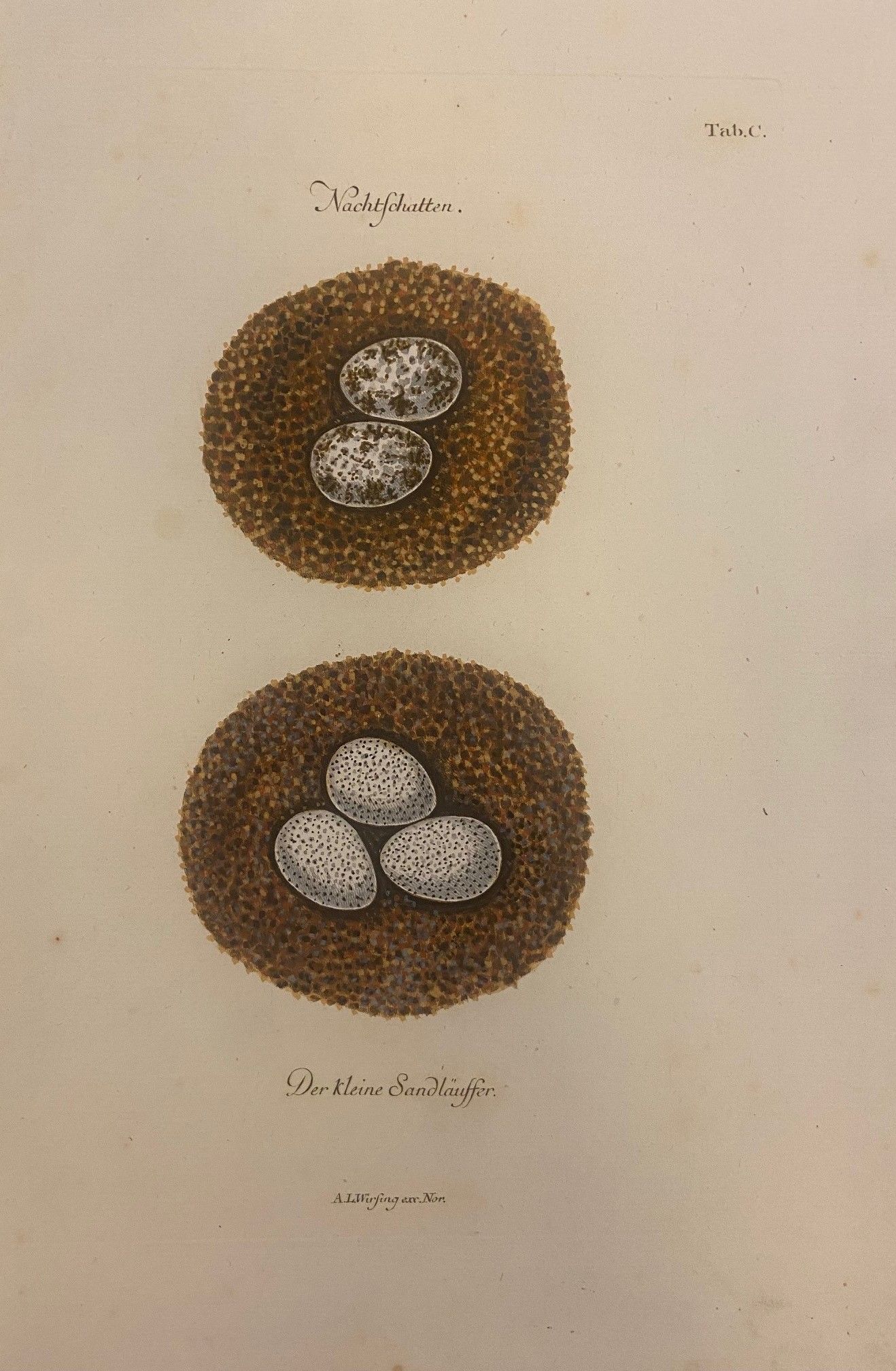 This beautiful 18th century engraving depicts two sandpipers' nest with spotted eggs.