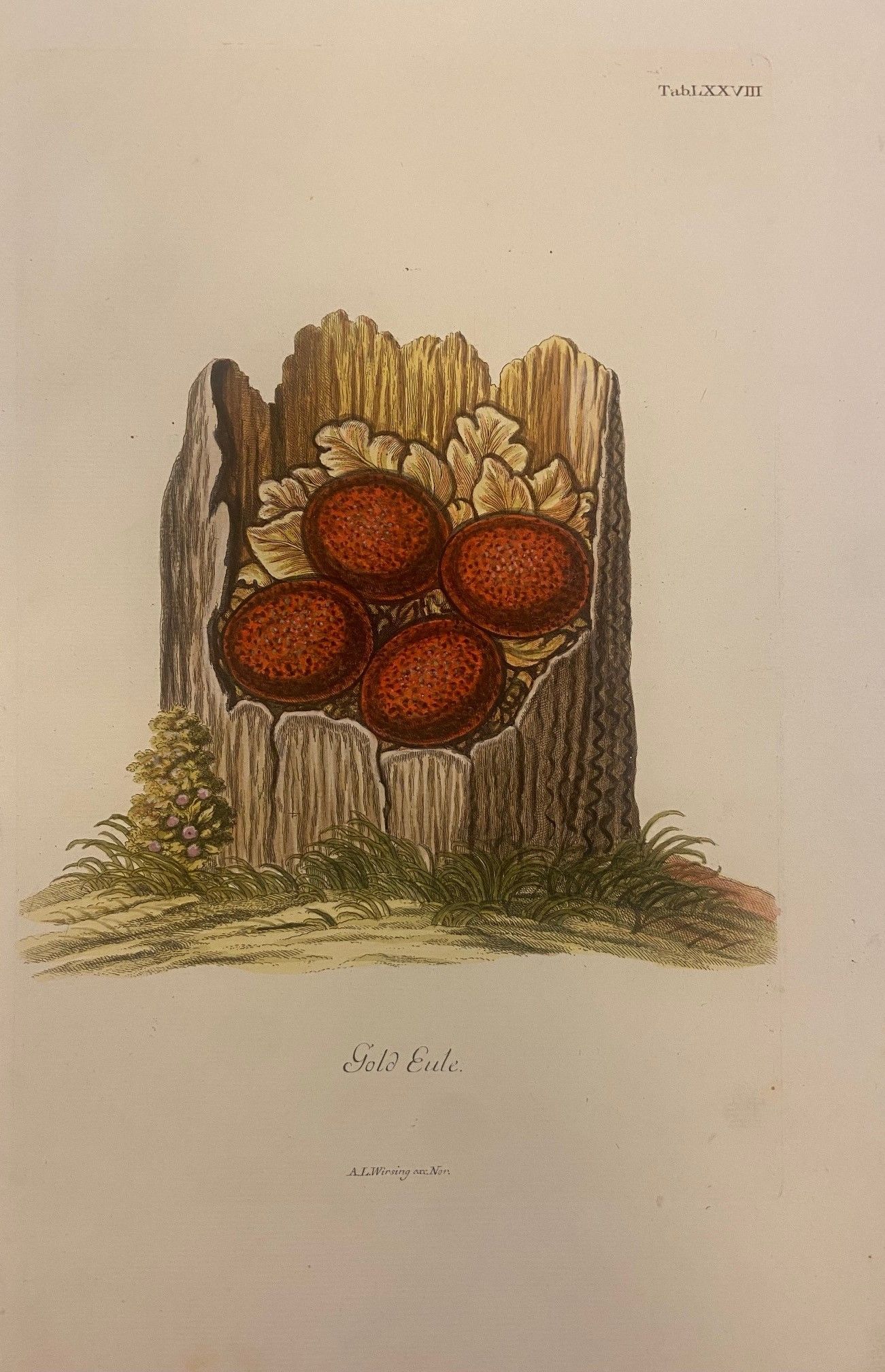 This beautiful 18th century engraving depicts four vibrant red spotted eggs resting on a bed of feathers in a hollowed tree stump, representing a Eurasian eagle-owl's nest.