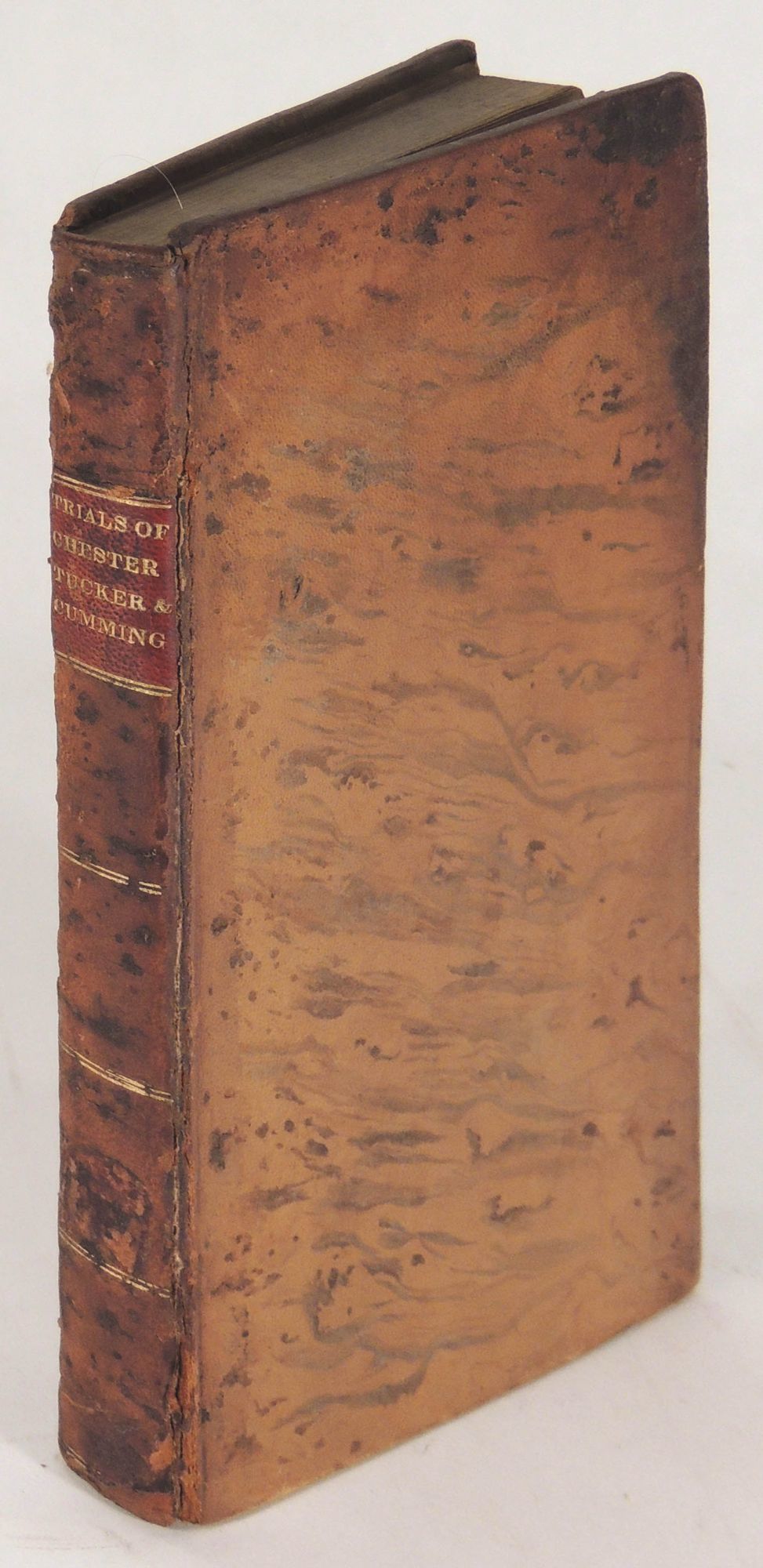 Schenectady, NY: Henry Stevens & Co, 1818. Hardcover. Very Good -. Hardcover. First Edition. A compilation of documents related to the trials of John Chester, Mark Tucker and Hooper Cumming. Chester and Tucker were accused of slandering Reverend Cumming, who in turn was accused of inappropriate behavior. Bound in full brown leather with red leather spine label. Leather is stained and worn with tender hinges. Offsetting to endpapers, and browning to pages. With a fold-out sheet outlining the charges by the committee at various points in the proceedings. With bookplate of William Ward Wight. Blue stamp of an honors academy on title page. Very good minus. Octavo. 255 pages plus errata page. REL/081621.