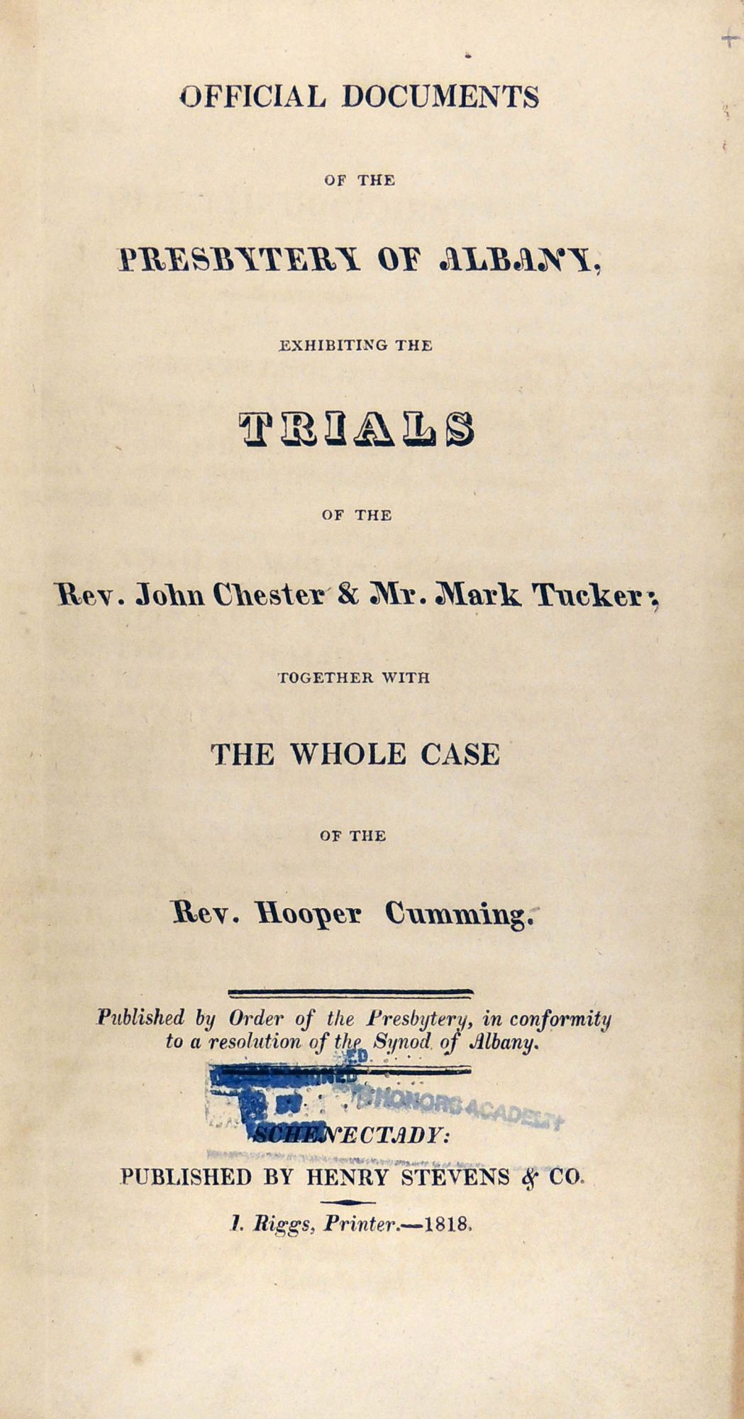 Official Documents of the Presbytery of Albany, Exhibiting the Trials of the Rev. John Chester & Mr. Mark Tucker: Together with the Whole Case of the Rev. Hooper Cumming