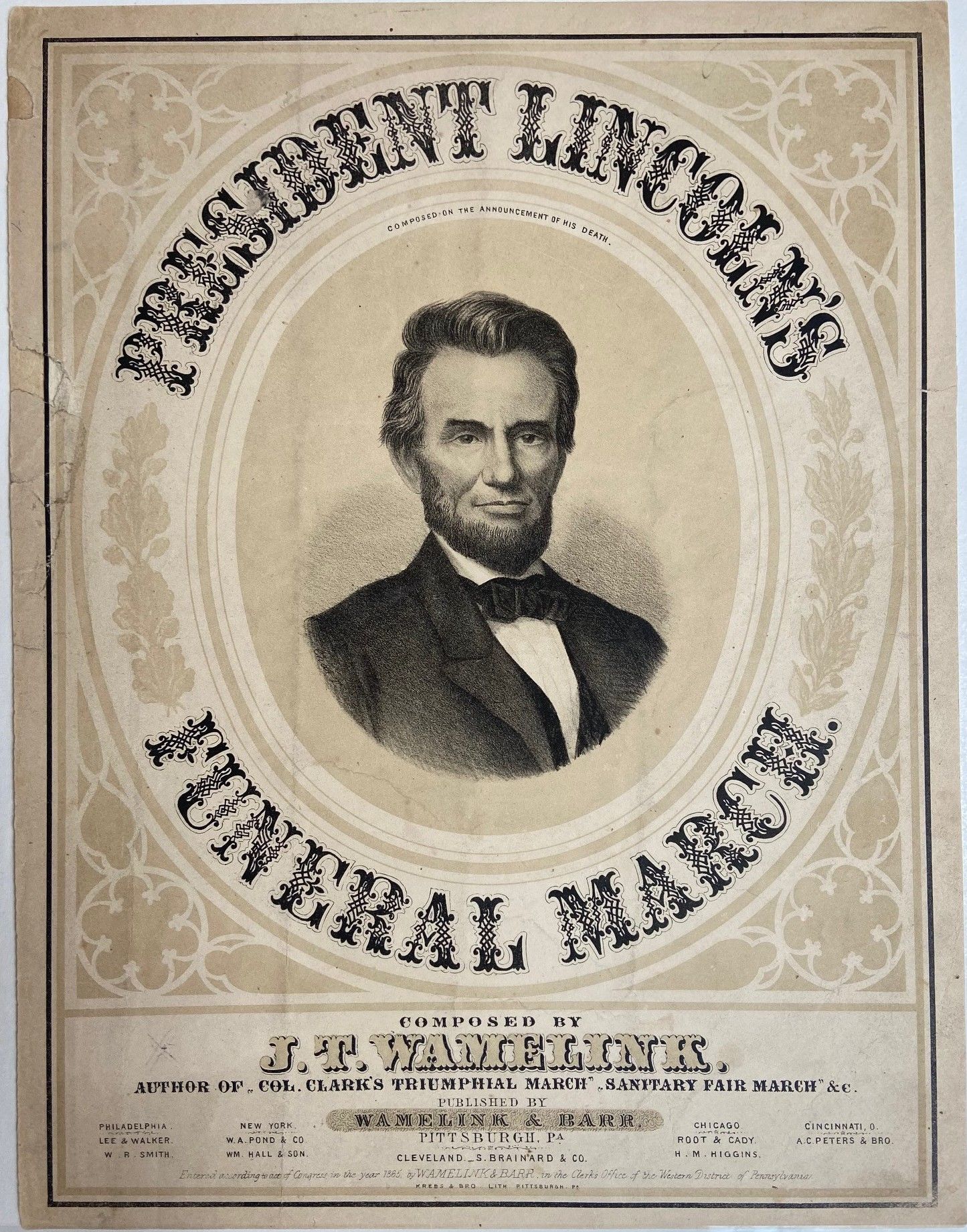 This handsome portrait of Abraham Lincoln was published as the front cover of the sheet music for his Funeral March. The Funeral March was composed by J.T. Wamelink on the day of the announcement of Lincoln's death. Does not include sheet music, only the front cover.