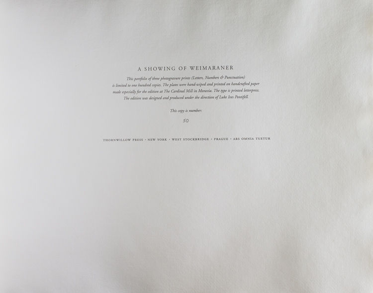 New York: Thornwillow Press, 1997. Limited to 100 copies with three loose photogravures signed by Wegman. Oblong elephant folio. Paper portfolio with silk ties in original cloth clamshell box. Fine. Limited to 100 copies with three loose photogravures signed by Wegman. Oblong elephant folio.