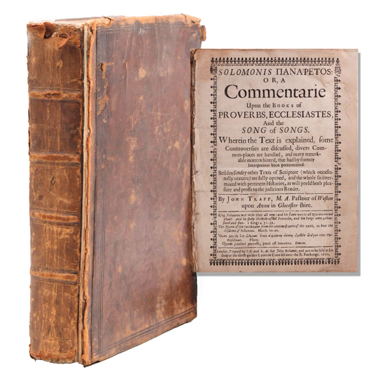 Solomonis panaretos: or, A commentarie upon the books of Proverbs, Ecclesiastes, and the Song of Songs. Wherein the text is explained, some controversies are discussed, divers common-places are handled, and many remarkable matters hinted, that had by former interpreters been pretermitted. Besides sundry other texts of scripture (which occasionally occurre) are fully opened, and the whole so intermixed with pertinent histories, as will yeeld both pleasure and profit to the judicious reader. By John Trapp, M.A. pastour of Weston upon Avon in Glocester shire