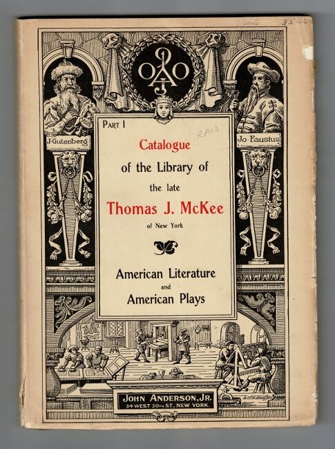 New York: John Anderson, Jr., 1900. 9 volumes, 8vo; vols. I-V with frontispieces and tissue guards; facsimiles of the title-pages of books offered for sale; original printed pictorial wrappers; wrappers fragile with some chips at spines and edges, else a very good set. McKee (1840-1899) began his collection by focusing on books, journals, photographs and playbills related to the British and American stage and eventually expanded his interests to include English and American literature and American history. The sale of McKee's library was a great success for the fledgling Anderson Auction Company with "books that might have sold for only ten cents [reaching] forty or fifty cents." Poe's Tamerlane commanded $2,050, the highest price of the sale and a record for the book. Dickinson, Dictionary of American Book Collectors, p. 227.