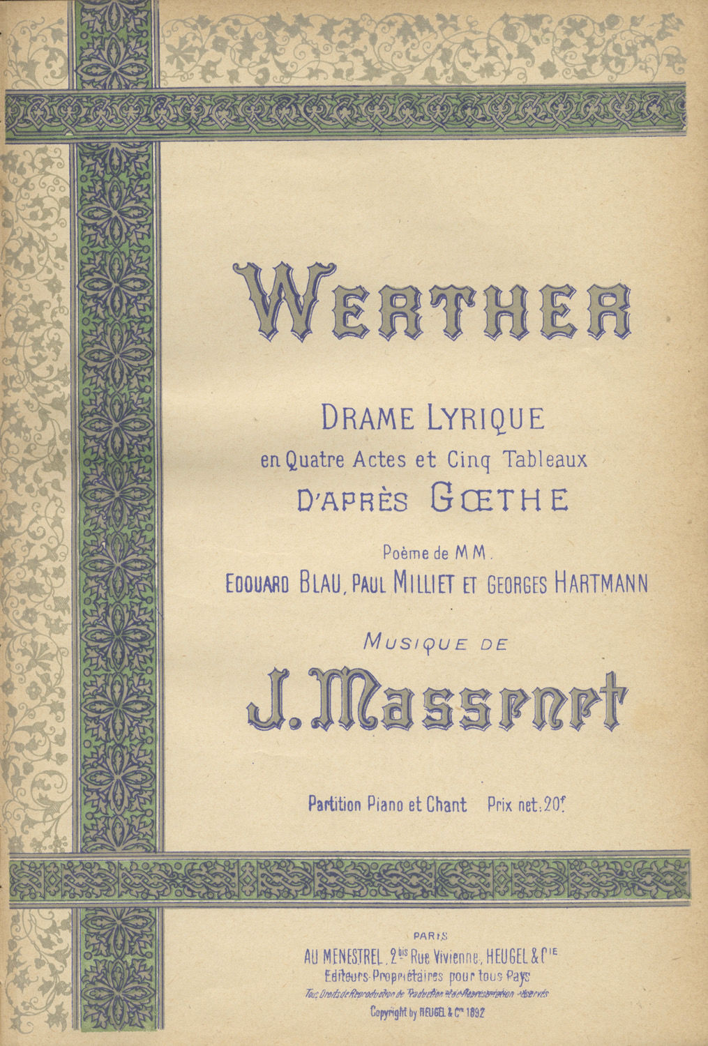 Werther Drame Lyrique en Qutre Actes et Cinq Tableaux d'Après Goethe Poème de MM. Edouard Blau, Paul Millliet et Georges Hartmann ... Partition Piano et Chant Prix net: 20f. [Piano-vocal score]