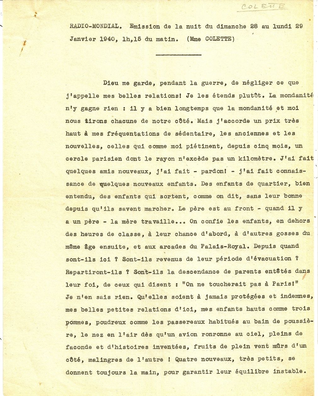 28 - 29 January 1940. Manuscript. Paperclip impression at corners, old horizontal crease. Near Fine. A six-page TYPED MANUSCRIPT in French SIGNED "Colette" at the conclusion on 8-1/4" x 10-3/4" sheets of paper. One of several lectures Colette gave on Radio Mondial. This one concerns her views of mondanité or worldliness.