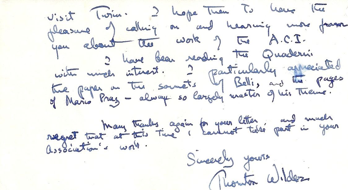 Hamden, CT. Letter. Some light wrinkling, otherwise Fine with exceptional content. A two-page AUTOGRAPH LETTER SIGNED (ALS) to Signor Cameramer on both sides of a 6" x 3-3/4" Deepwood Drive index card with two holes punched in the left margin. In full: "Many thanks for your letter, for your generous invitation, and for the copies of the Quaderni. These last few years I have delivered many lectures -- especially last year at Harvard. The result has been that I have now taken a 'vow' not to speak in public for a number of years. My many visits to Italy have been a constant joy. I hope to make many more, and soon. I particularly wish--for the first time--to visit Turin. I hope then to have the pleasure of calling on and hearing more from you about the work of the A.C.I. I have been reading the Quaderni with much interest. I particularly appreciated the paper on the sonnets of Belli, and the pages of Mario Praz -- always so largely master of his theme. Many thanks again for your letter, and much regret that at this time I cannot take part in your Association's work. Sincerely yours, Thornton Wilder." The QUADERNI ACI (Associazione Culturale Italiana) was a periodical published in Turin.