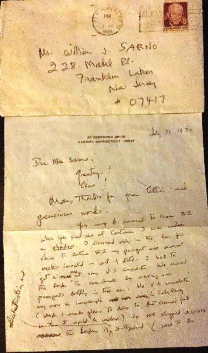 Hamden, CT, 31 July 1972. Letter. Crease from folding, otherwise Fine in a Near Fine envelope. A charming two-page AUTOGRAPH LETTER SIGNED (ALS) to William J. Sarno on both sides of his 6" x 6-7/8" Deepwood Drive stationery thanking him for his letter and generous words. In part: "You may be amused to learn that when you saw me at Cortina I was under a shadow. I discovered only on the bus from Venice to Cortina that my passport was several weeks invalid.... We crossed the border to Innsbruck by waving our passports boldly in the air.... So we crossed the border of Lichtenstein and Switzerland (said to be very rigorous in such matters) by sheer bluff and got the new passport in Zurich.... A friend of mine now 101 -- long a professor of Latin at the Univ. of Pennsylvania -- has kept young by his passion for collecting fossil shells. He has found (in quarries, railway cuttings, excavating for wells, etc.) several unknown to science-- They are recorded in the Smithsonian and named 'in perpetuity' after his successive wives." With the envelope addressed in Wilder's hand.