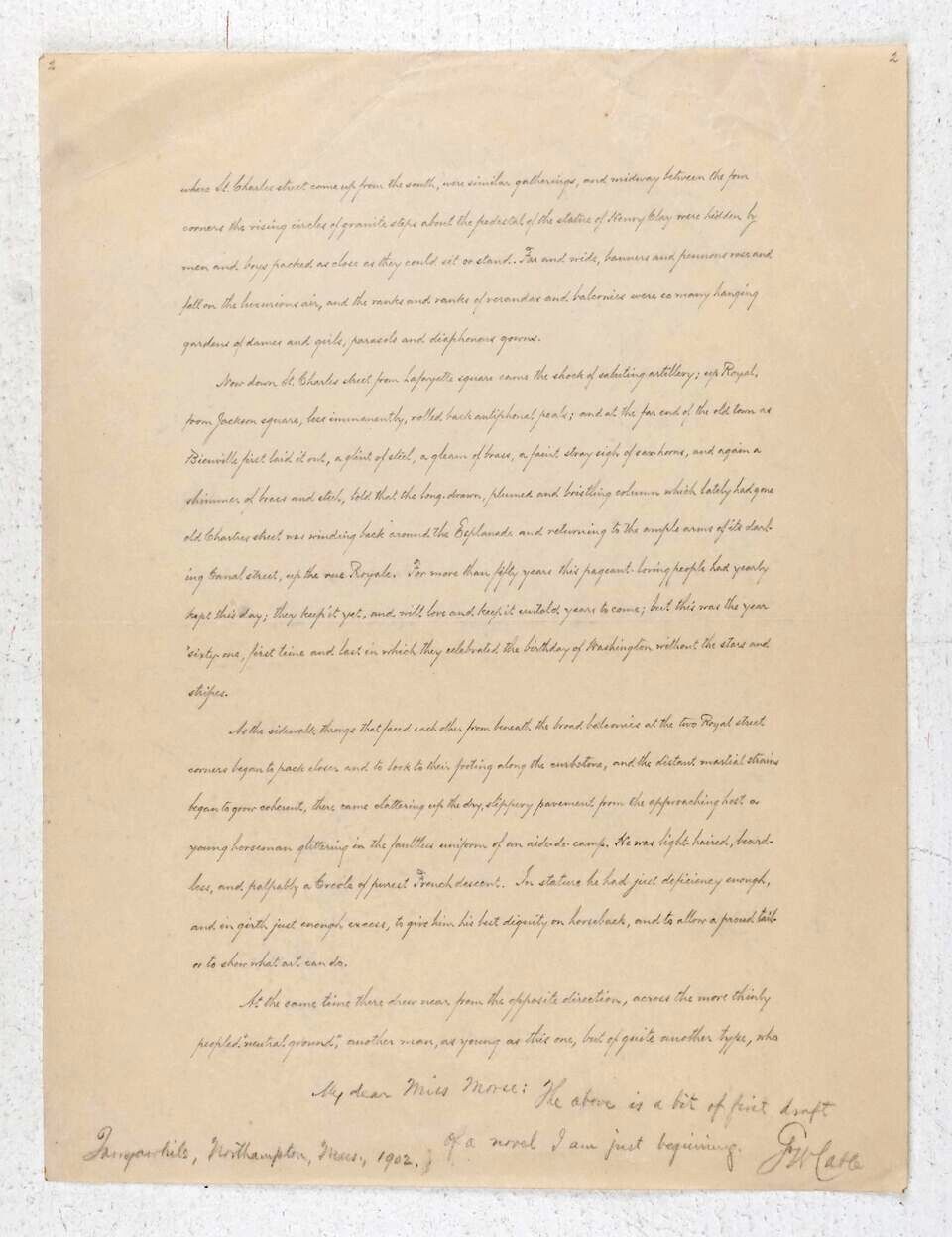 Northampton, MA, 1902 - 1903. Letters and Manuscripts. Some tears and wrinkles; two letters are laid down on cardboard. Very Good condition overall. Superb collection of material by this former Confederate soldier and important, neglected writer who paved the way for modern Southern writers such as Faulkner and Welty in dealing with the pervasive issue of race. Includes 9 AUTOGRAPH LETTERS SIGNED (ALSs) to Confederate officer Alexander Porter Morse; 1 AUTOGRAPH LETTER SIGNED (ALS) to publisher Charles Scribner; 2 AUTOGRAPH MANUSCRIPTS SIGNED (AMSs) addressed to Morse's children; and 2 TYPED LETTERS, unsigned, from Morse to Cable; along with 5 envelopes addressed in Cable's hand. The letters mostly concern Cable's work and his interest in Morse's experiences in the Civil War. The letter from Cable to Scribner is one of introduction for Morse. Some excerpts: "I have begun another cavalry story of New Orleans and Vicksburg, and I want to sit you down in my library and make you talk. Oh dear! how can I wait? And I must see that book of Howell Carter [A CAVALRYMAN'S REMINISCENCES OF THE CIVIL WAR]." "I thank you for the little sketch and picture of General Pickett, which I return with this letter. Gettysburg would be quite too much out of focus for my story." "I am today expressing your invaluable diary back to you. It has given me many a good point and I wish I might see it again when I get deeper into the actual writing of my story -- the final writing, I mean.... I hope you will like 'Strong Hearts.'" "I have your letter of the 17 and am enjoying the manual of Artillery Tactics greatly. It delights me that I have chosen my hero from this so highly scientific arm of the services, an arm which has been so oddly overlooked by the story-tellers." "I am delighted with 'The Cannoneer' [Augustus Caesar Buell: THE CANNONEER: RECOLLECTIONS OF SERVICE IN THE ARMY OF THE POTOMAC]. It gives me points already though I have just received it and have not looked into it more than four pages deep.... I wish you could see how I have changed to opening of my story. I have it right this time, and this again I owe, in degree, to you -- to your patient and interested attention to my reading of the first draft." Included in this archive are the first two pages of that first draft which differ greatly from the published version, both written in a very small hand and INSCRIBED and SIGNED by Cable at the bottom of each page, both apparently to the son and daughter of Morse who are described by Morse in his letters to Cable as fiercely competing to read a copy of Cable's THE CAVALIER that was in the Morse home. KINCAID'S BATTERY, about a Confederate army artillery unit set in New Orleans, was not published until 1908.