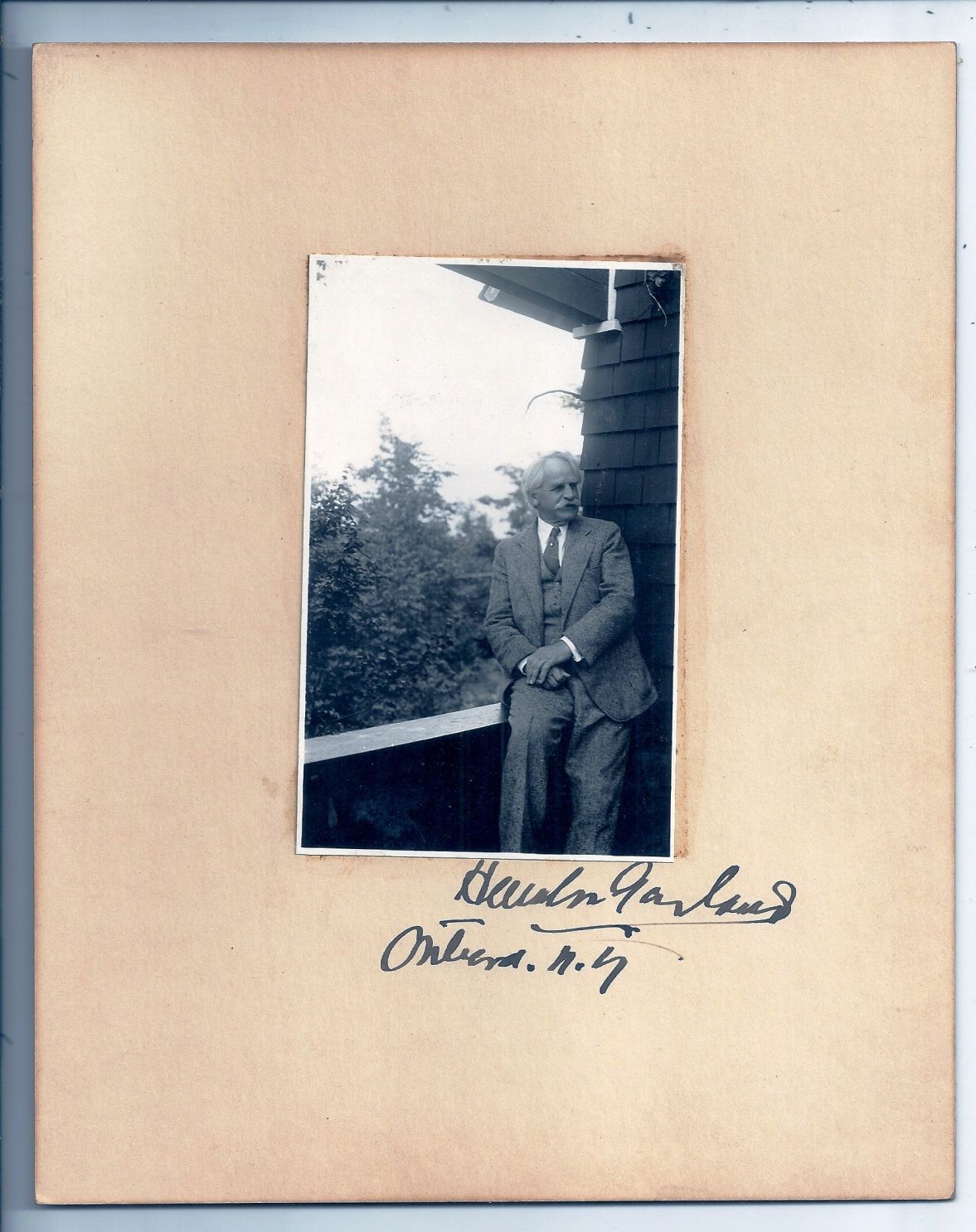 Photograph. Minor staining to photograph. Near Fine. A 3-1/4" x 5-1/4" black-and-white photograph of Garland sitting on a porch rail, laid down on an 8" x 10" piece of cardboard, SIGNED by Garland in dark ink beneath the image along with the place: Onteora, New York.