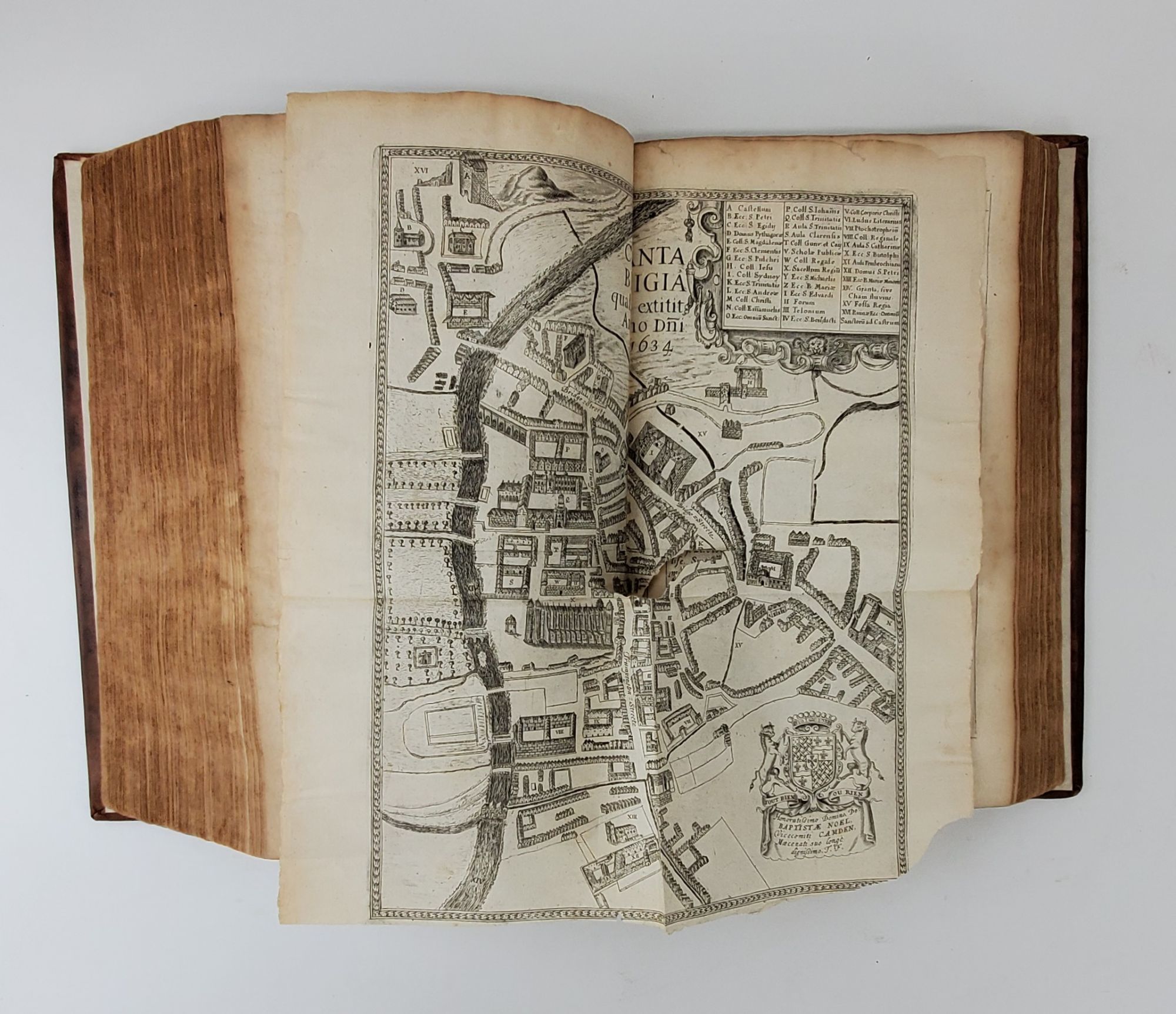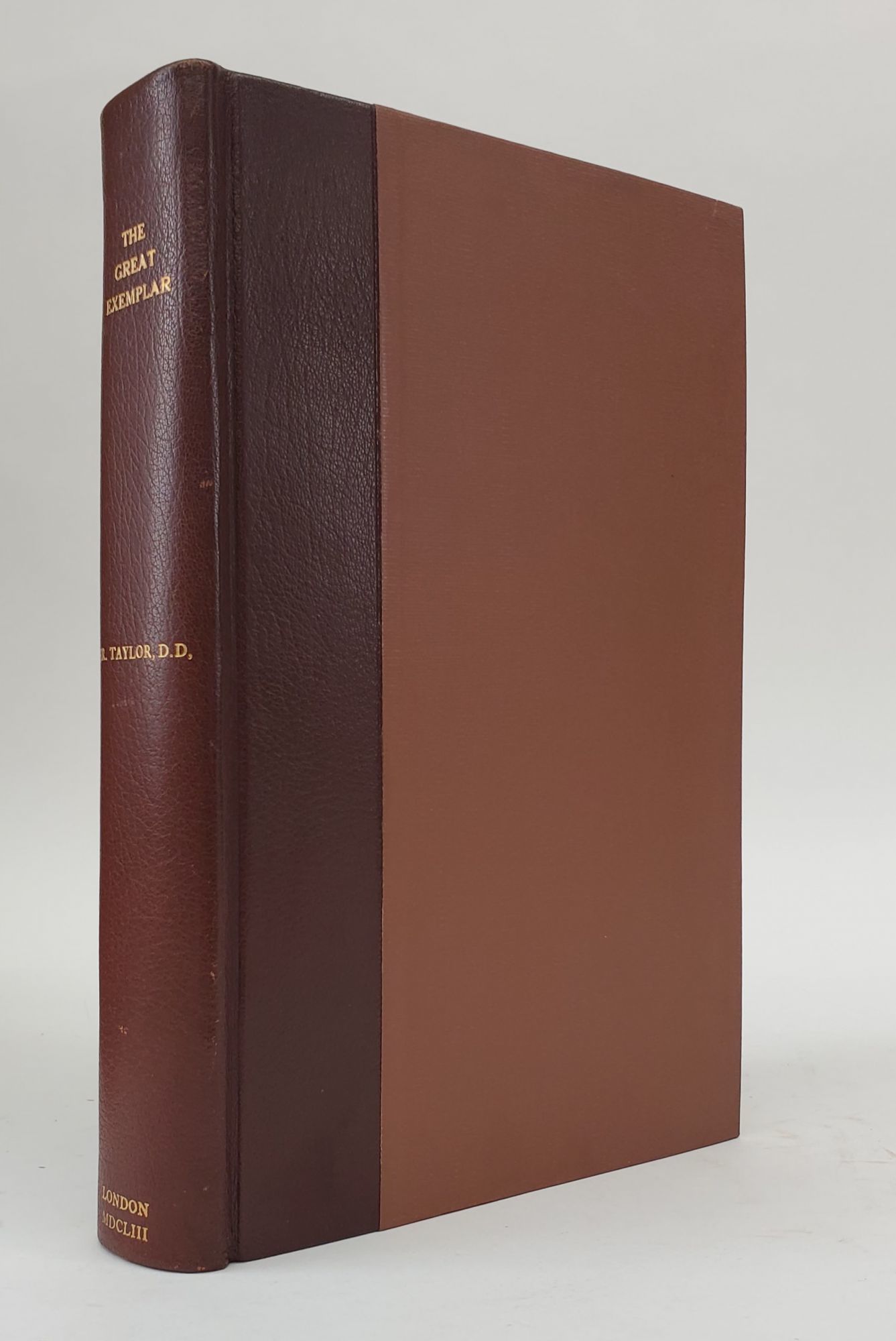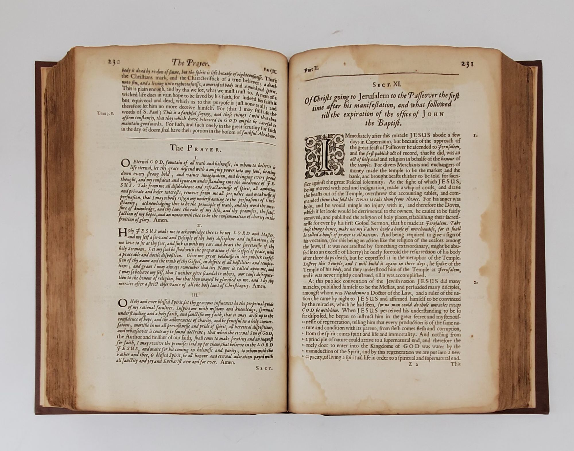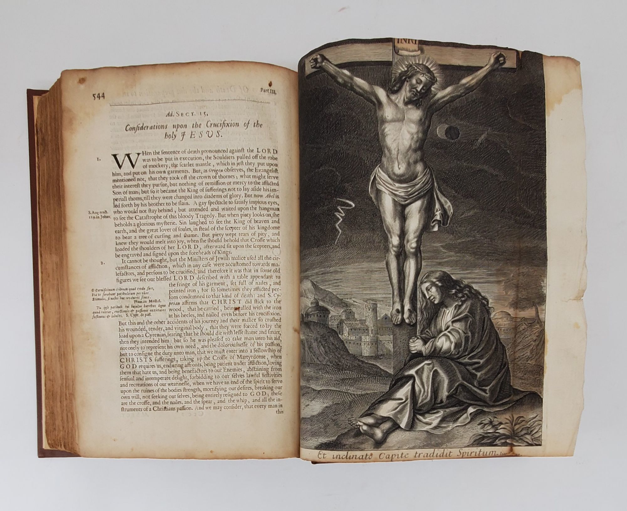 London: Printed by James Flesher, 1653. Second Edition. Hardcover. Folio, [52], 568 pages, [12], [11] plates. In Very Good condition; Half bound in brown leather with cloth boards and gilt lettering to spine. Light shelf wear with a few scratches to rear board. Archival repair to frontispiece, small open tear to outer margin of title page, gift inscription on front free endpaper, damp staining to top and fore edges of text block interiorly throughout, scattered stains throughout, Pencil and ink annotations throughout. Includes an additional engraved title page (*1v). General title page and first internal title page in red and black. "The history of the life and death of the Holy Jesus", in three parts, has separate dated title page for each part. Includes index. One page of publishers ads at back. JR Consignment. Shelved Room A Oversize.
