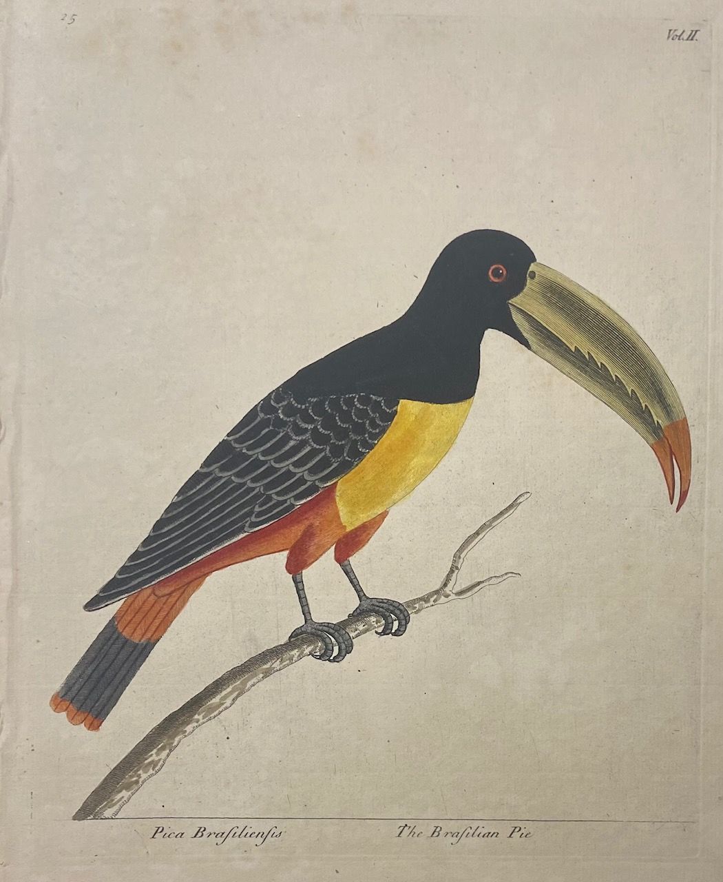 Engraving from "A Natural History of Birds: Illustrated with a Hundred and four Copper Plates, Engraven from the Life, Published by the author Eleazer Albin, and carefully colour'd by his Daughter and Himself, from the Originals, drawn from the live Birds." The beautifully hand colored print depicts a species of Toucan believed to be native to Brazil, with a black head and wings, a yellow breast, and red body and tail.