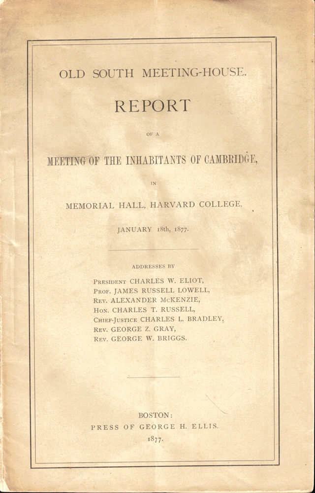Old South Meeting-House Report of a Meeting of the Inhabitants of Cambridge in Memorial Hall, Harvard College January 18th, 1877