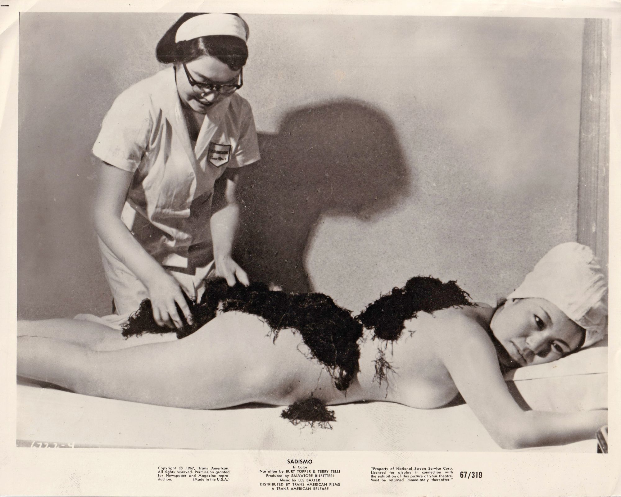 N.p.: Trans American Films, 1967. Vintage studio still photograph from the 1967 documentary film, showing a nurse applying seaweed to a naked woman's back and legs. Layout annotations to the verso.