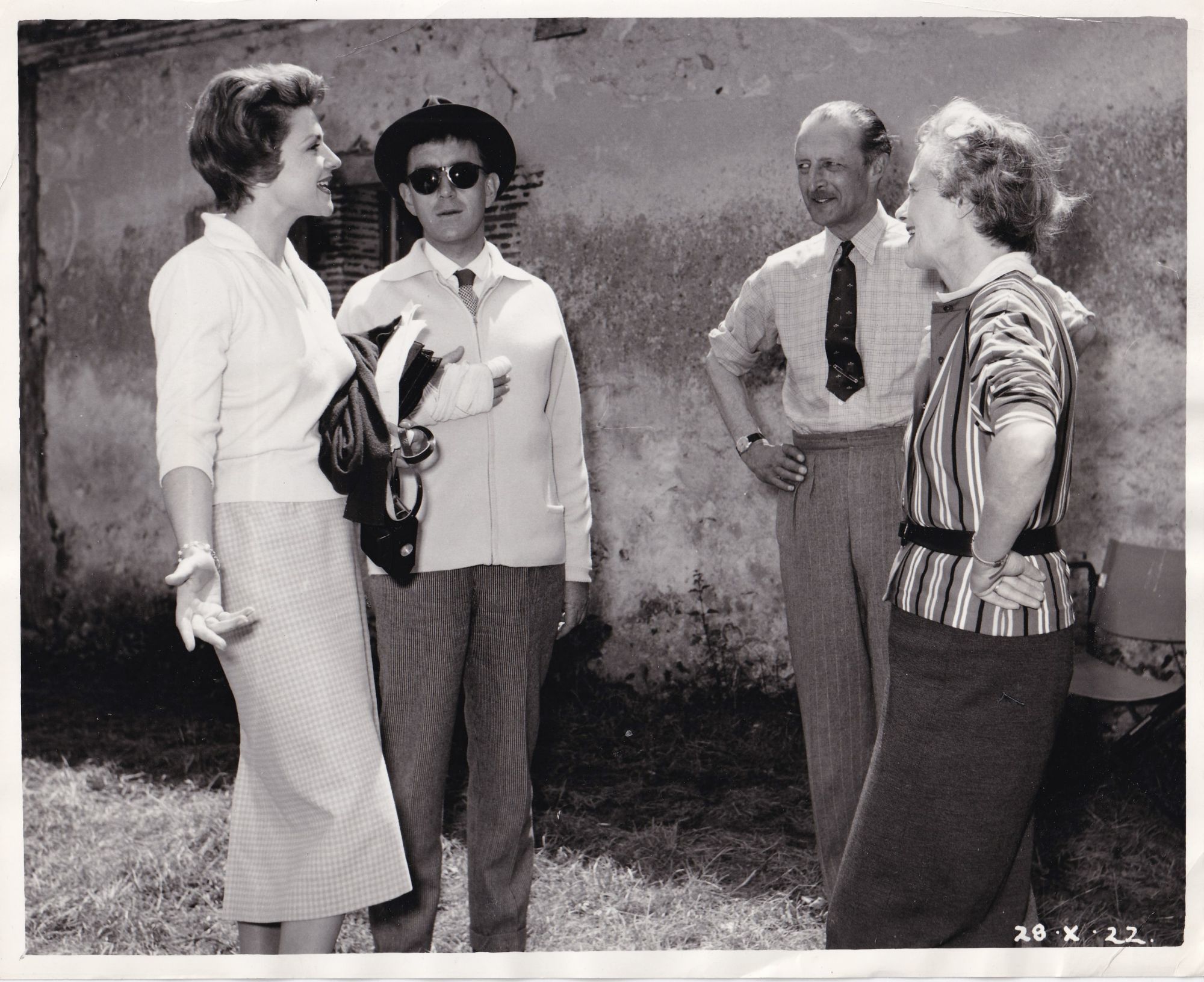 Beverly Hills, CA: Metro-Goldwyn-Mayer [MGM], 1959. Vintage reference photograph of novelist Daphne Du Maurier and her husband, Sir Frederick Browning, visiting actors Alec Guinness and Nicole Maurey on the set of the 1959 film. Printed mimeo snipe affixed to the verso.