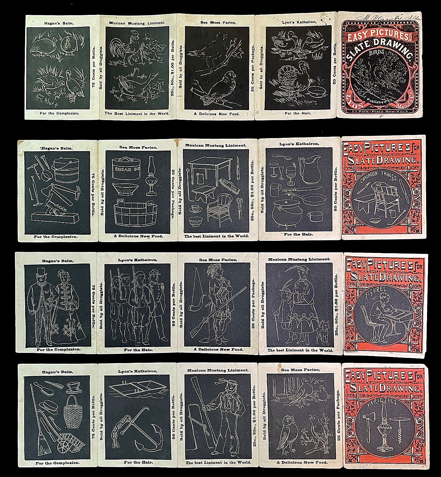 Four (4) fold-out promotional brochures titled "Easy Pictures for Slate Drawings" presented by Lyon Manufacturing Co. makers of cosmetics and patent medicine. They include Birds, Common Things, Varieties and Figures. Illustrations on one side and promotion on the reverse.
