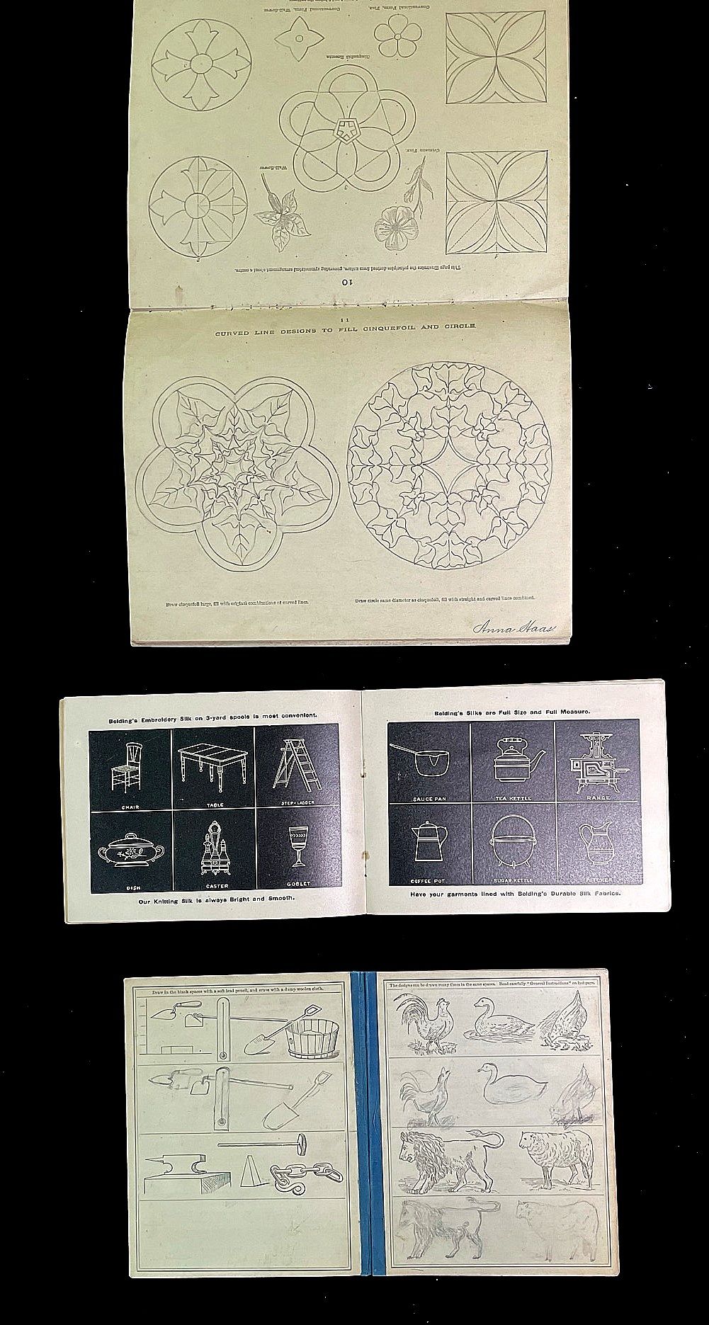 Slate Drawings - Useful & Instructive. c1880. 16 pp. Another promotional piece given by Belding Bros Silk with the same format of white on black and product advertising surrounding the images, but 20 plus years after the originals. Instructions inside front cover. The largest piece. White's School Series of Industrial Drawing measures 7" x 9".