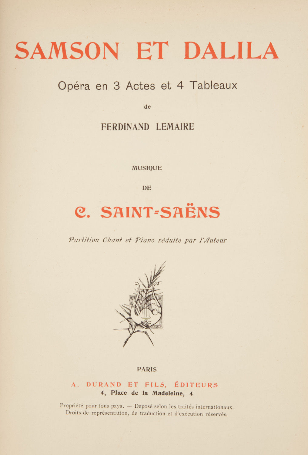 Samson et Dalila Opéra en 3 Actes et 4 Tableaux de Ferdinand Lemaire ... Partition Chant et Piano réduite par l'Auteur. [Piano-vocal score]