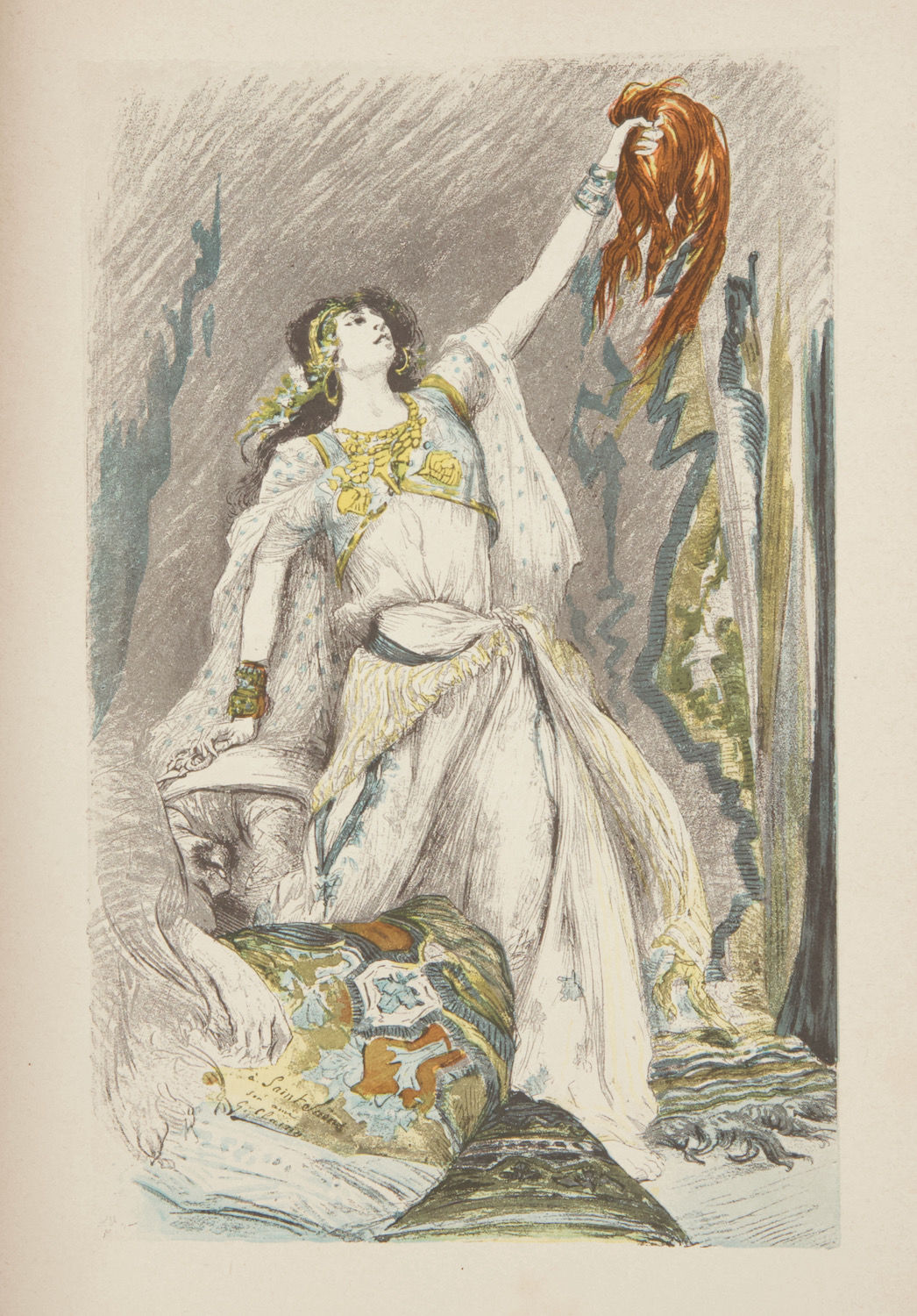 Paris: A. Durand et Fils [PN D. & F. 5583], 1900. Large octavo. Quarter dark brown morocco with marbled boards, raised bands on spine in compartments, black title label gilt, marbled endpapers. 1f. (recto half-title, verso blank), 1f. (recto dedication, verso publication note), 1f. (recto blank, verso heliogravure portrait engraving of Saint-Saëns with reproduction autograph musical quotation), 1f. (recto title in red and black, verso blank), 1f. (recto notes on first performances and named cast list, verso blank), 1f. (recto color plate depicting Dalila holding Samson's hair, verso blank), 1f. (recto notes on first performance and named cast list, verso blank), 1f. (irecto index, verso blank), 285, [i] (blank) pp.