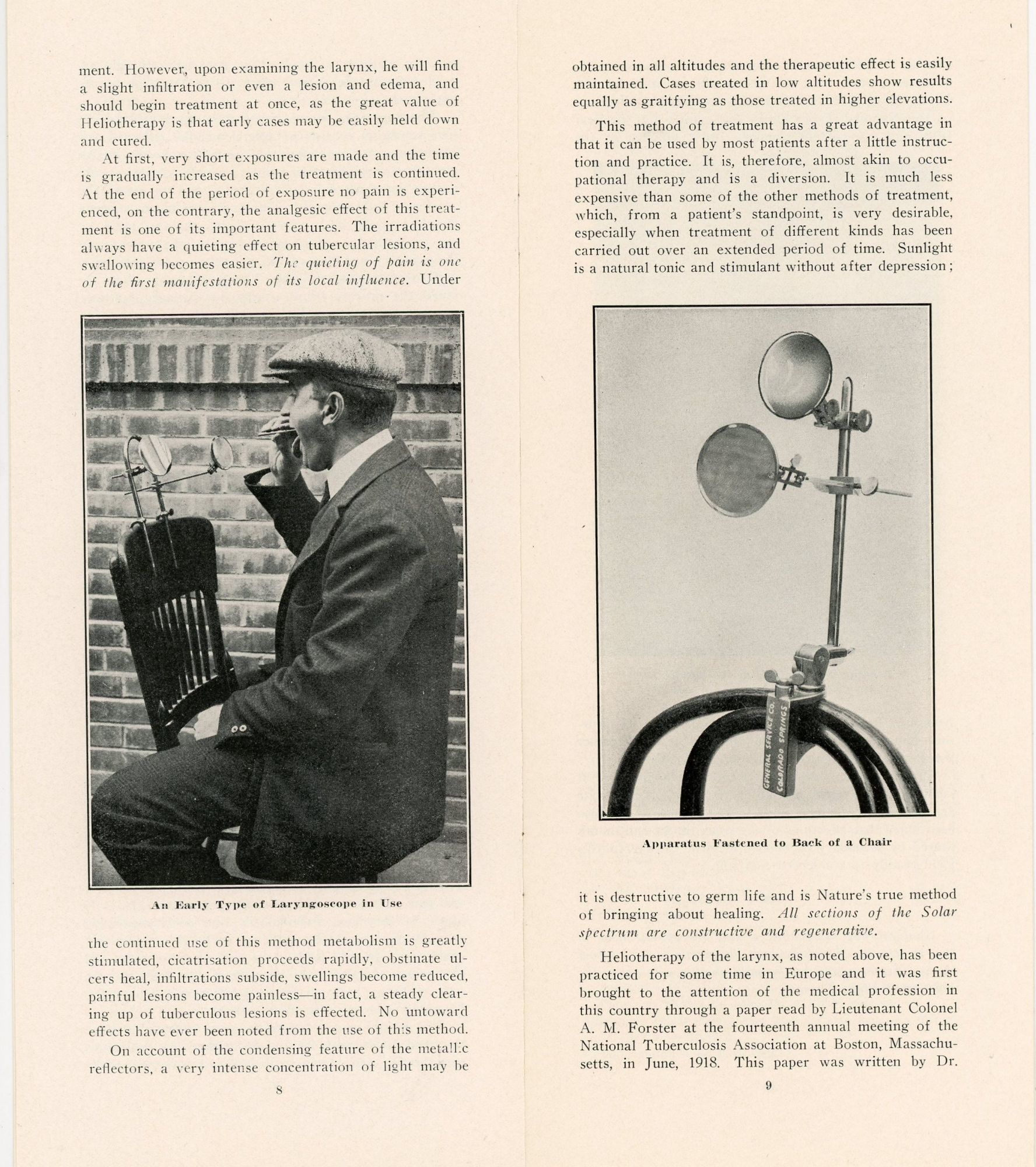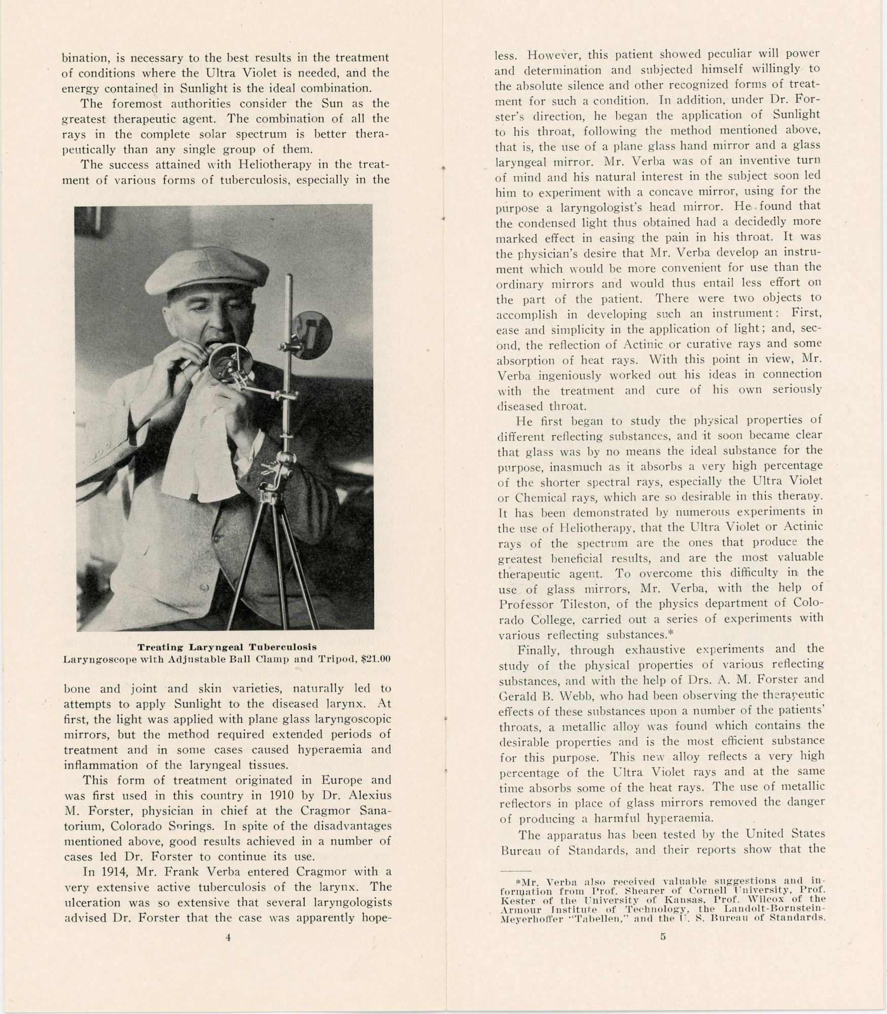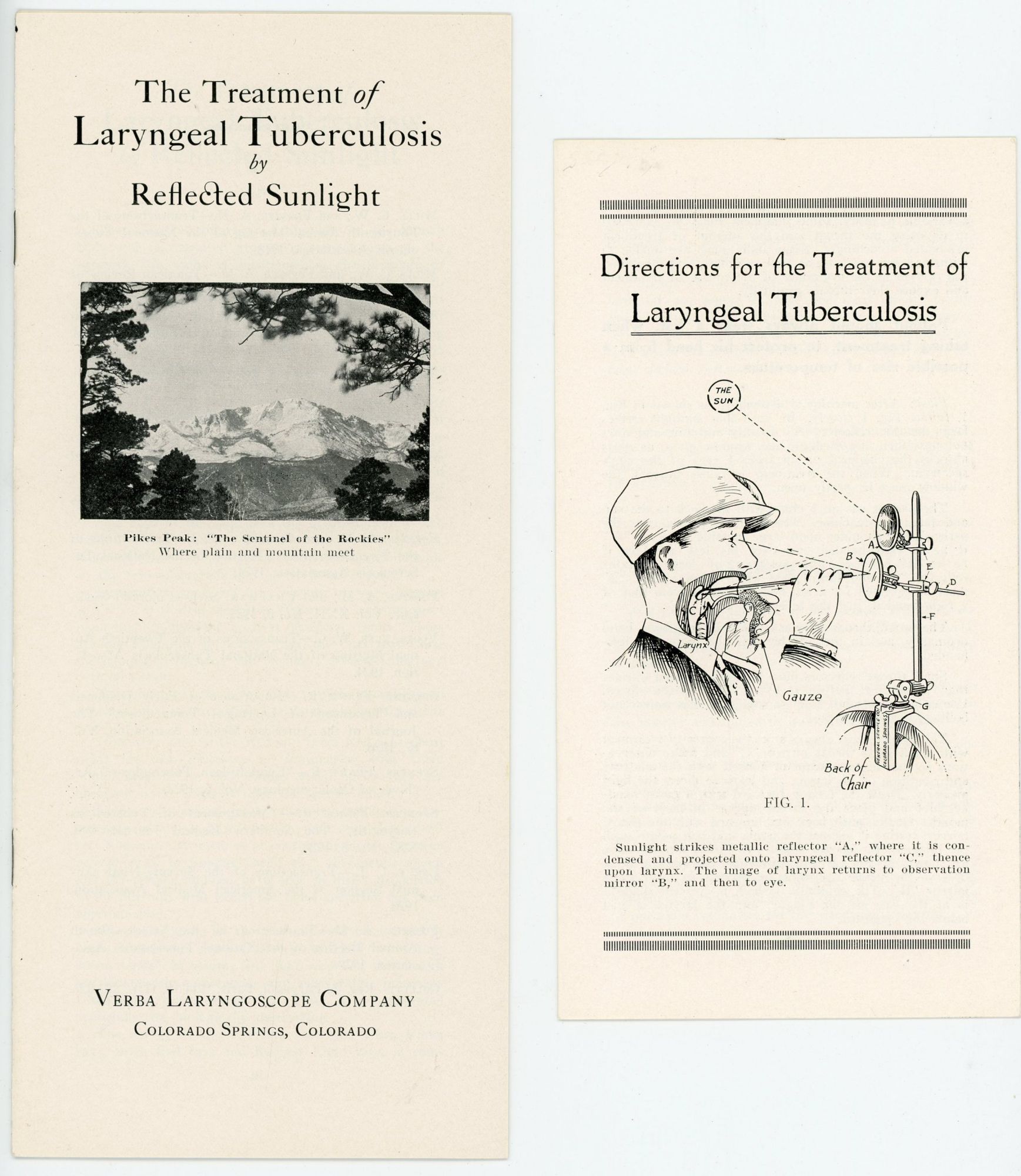 Colorado Springs, CO: Verba Laryngoscope Company, 1918. Two pamphlets, the first 10 pp. with images from photos throughout is The Treatment of Laryngeal Tuberculosis by Reflected Sunlight developed by a Frank Verba who in 1914 had severe laryngeal tuberculosis and was told by many doctors his case was hopeless. It describes his journey, how it was tested and the apparatus was developed and used. Images of device and parts, using the device and the complete kit. Measures 9 1/2" x 4". The second 6 pp. brochure is Directions for the Treatment of Laryngeal Tuberculosis. Providing detailed information on placing the reflectors and that the patient should always wear a hat when taking treatment to protect the head from a possible rise of temperature. Also includes instructions for assembling the machine.