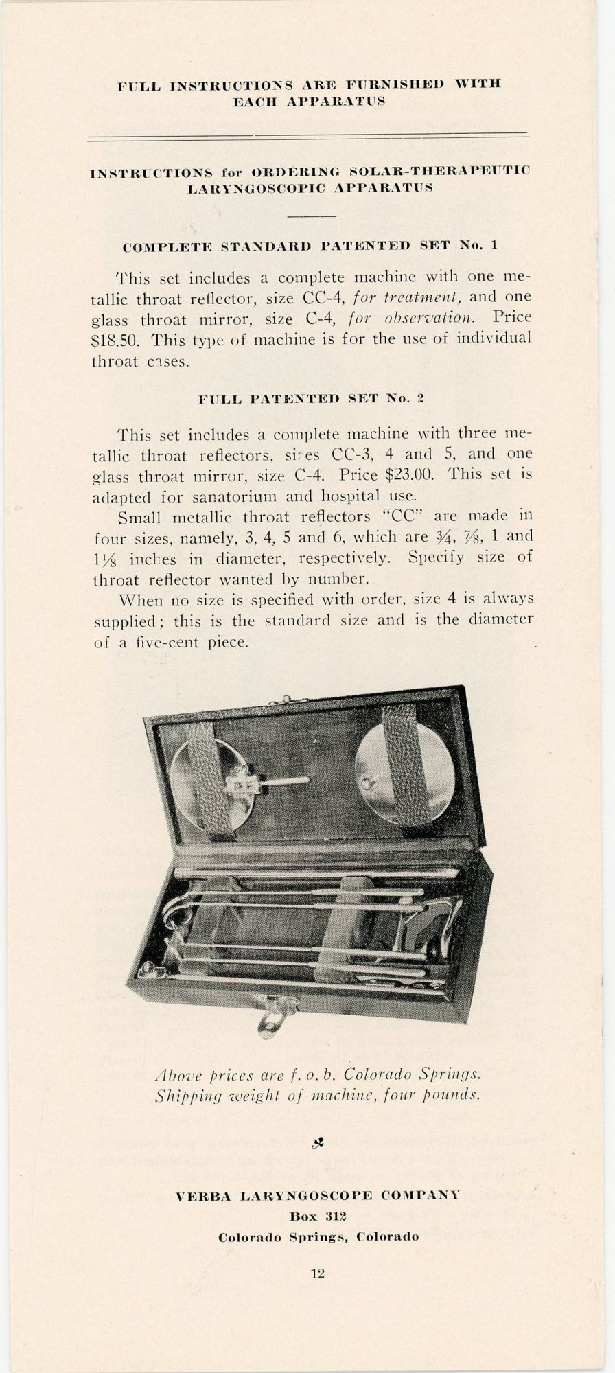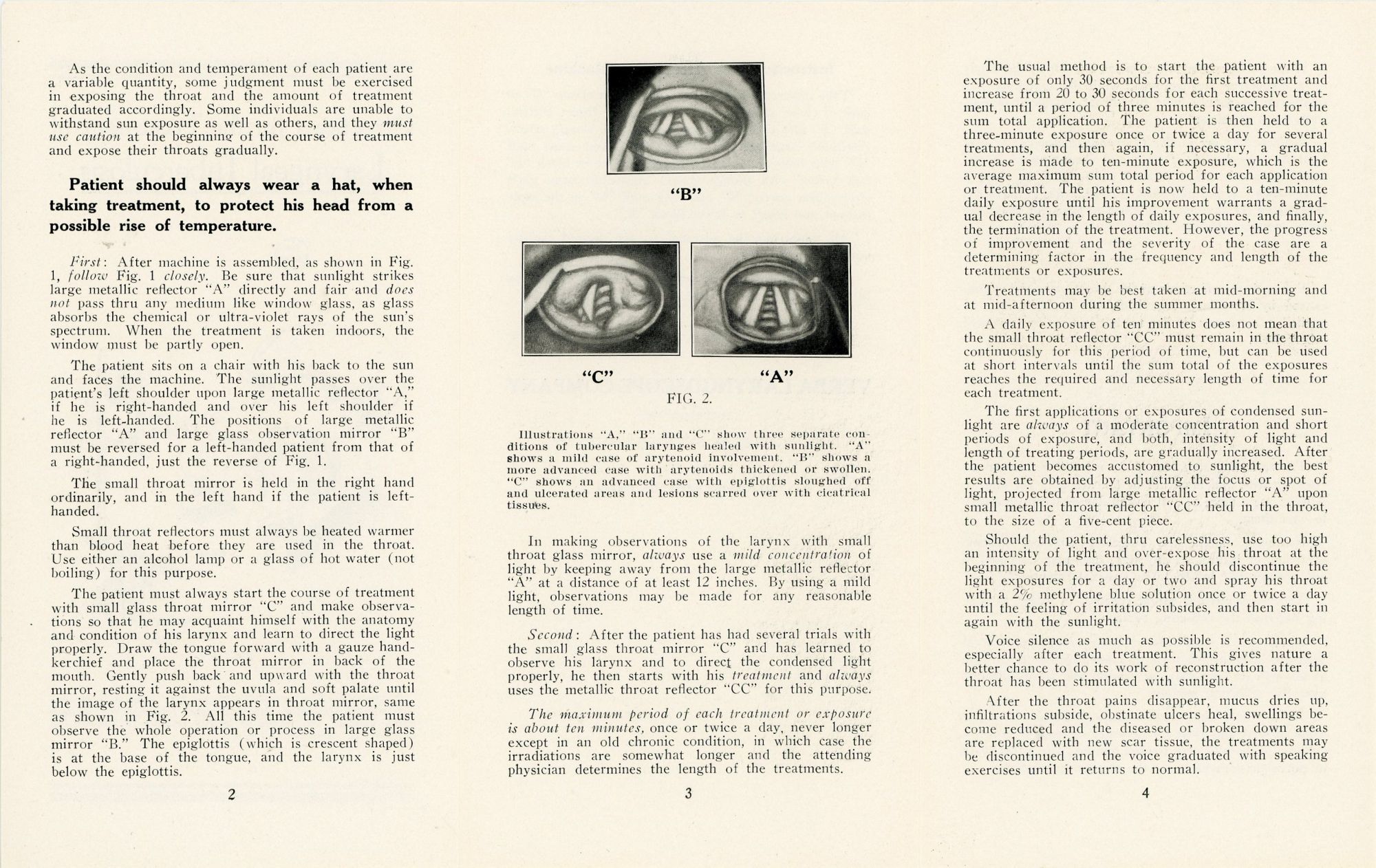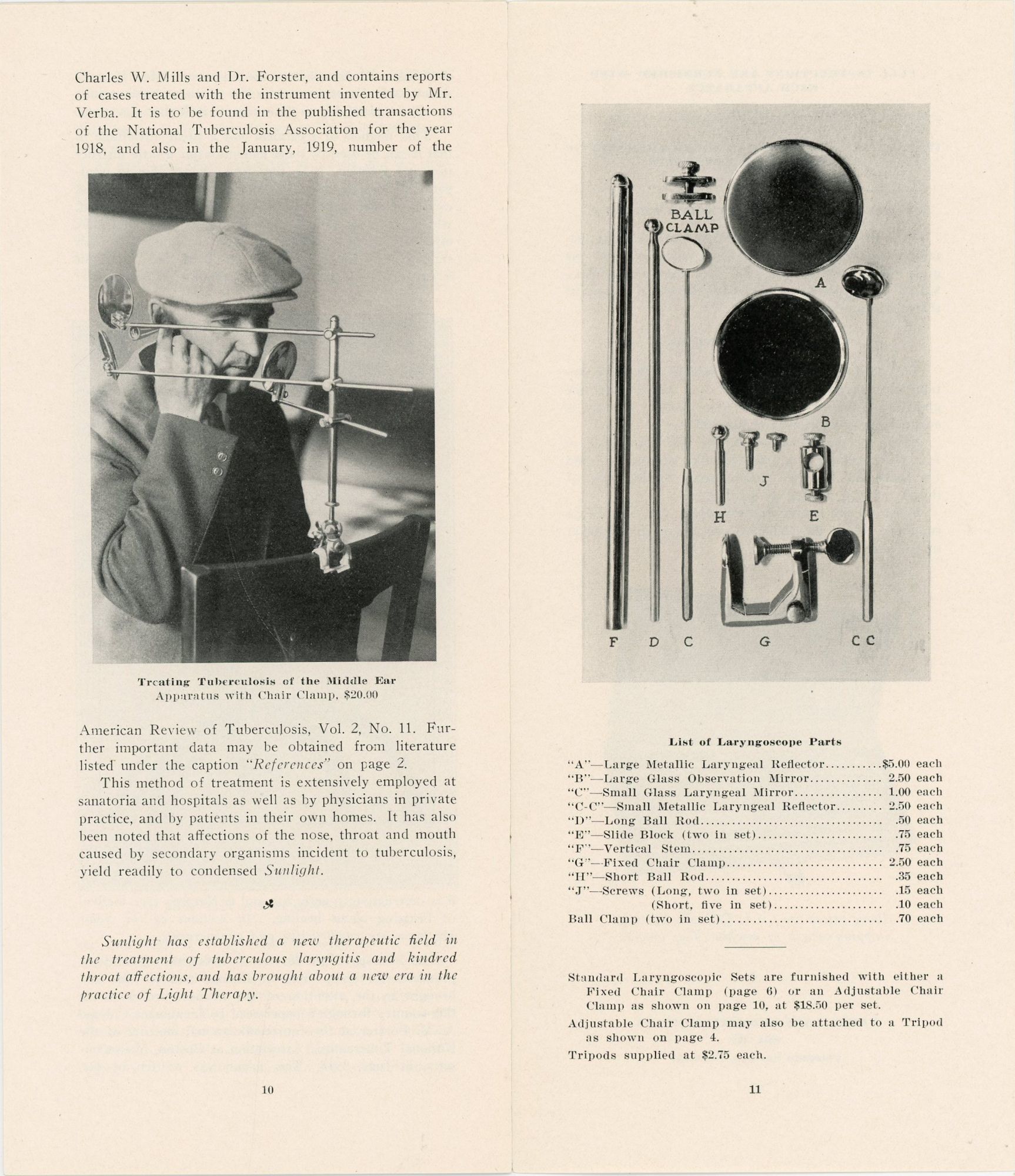 Colorado Springs, CO: Verba Laryngoscope Company, 1918. Two pamphlets, the first 10 pp. with images from photos throughout is The Treatment of Laryngeal Tuberculosis by Reflected Sunlight developed by a Frank Verba who in 1914 had severe laryngeal tuberculosis and was told by many doctors his case was hopeless. It describes his journey, how it was tested and the apparatus was developed and used. Images of device and parts, using the device and the complete kit. Measures 9 1/2" x 4". The second 6 pp. brochure is Directions for the Treatment of Laryngeal Tuberculosis. Providing detailed information on placing the reflectors and that the patient should always wear a hat when taking treatment to protect the head from a possible rise of temperature. Also includes instructions for assembling the machine.