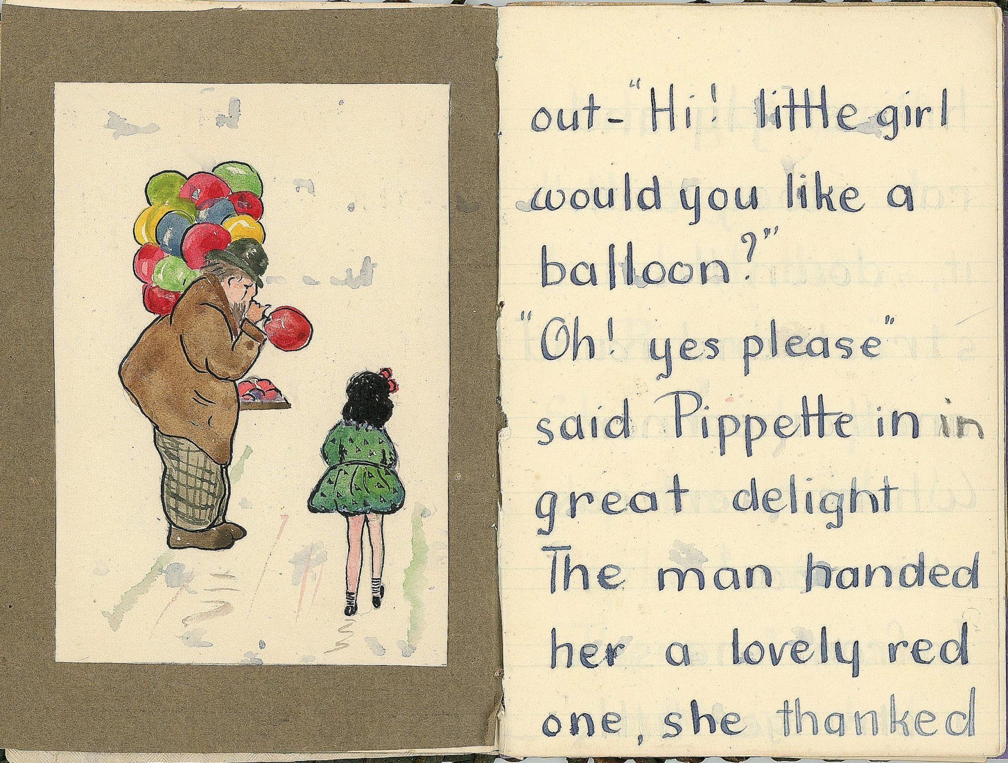 United Kingdom, 1940. Partial separation on end papers back cover. Minimal detraction.. The story of princess Pippette who lived with her parents the King and Queen and the Royal Nurse in a castle. In essence - she had a bad day was playing with her best crown, knocked the jewels out and was spanked by the Royal Nurse. She ran away from the castle, being out for the first time in her life, explored the world was given a balloon by the balloon man. She happened upon the "Pinnikins" fairies in a fairy land with toadstool tables and custard in acorn cups, where she witnesses adventures and misadventures. When the "clock struck" she realized she was hungry and went back to the castle, was welcomed with open arms and not punished as all were pleased at her safe return. Told in a fair more charming and engaging way...