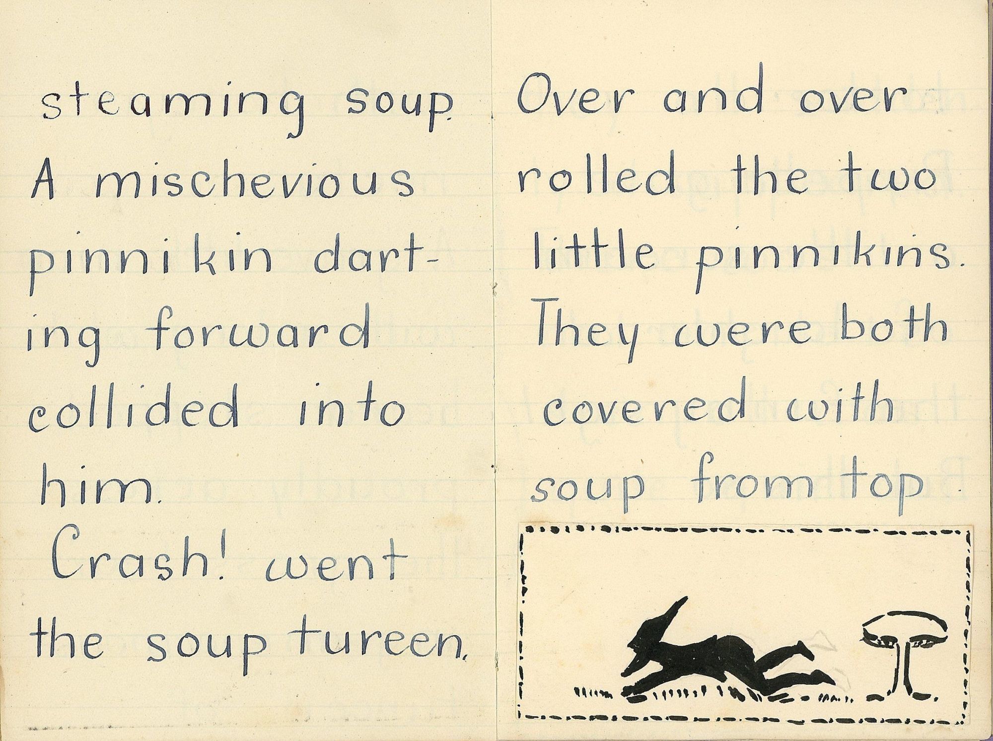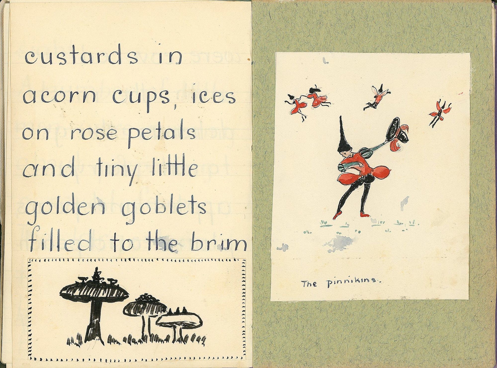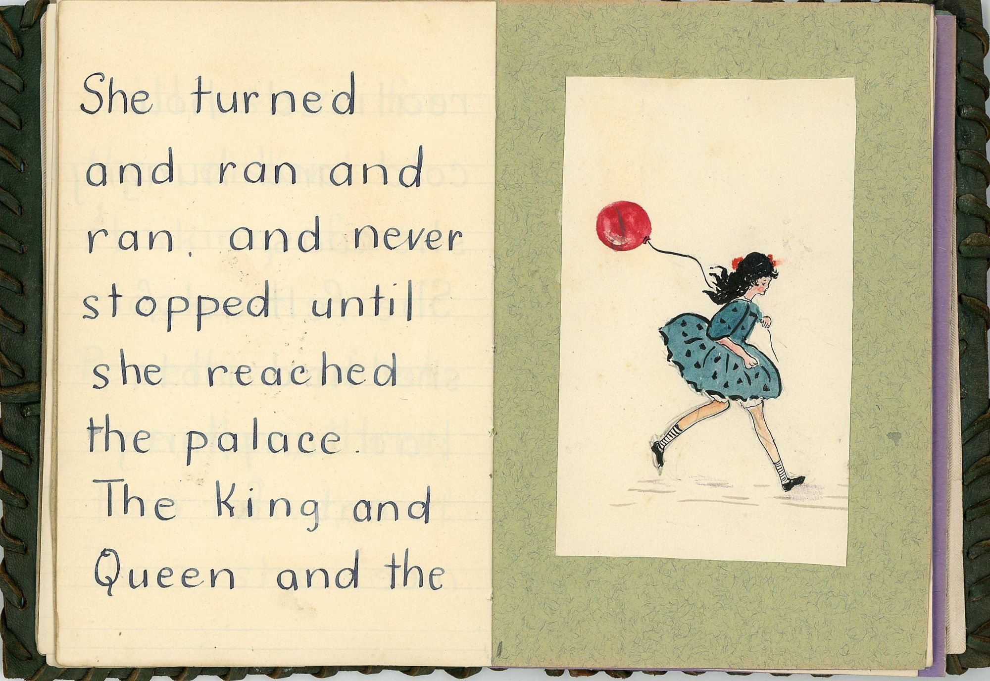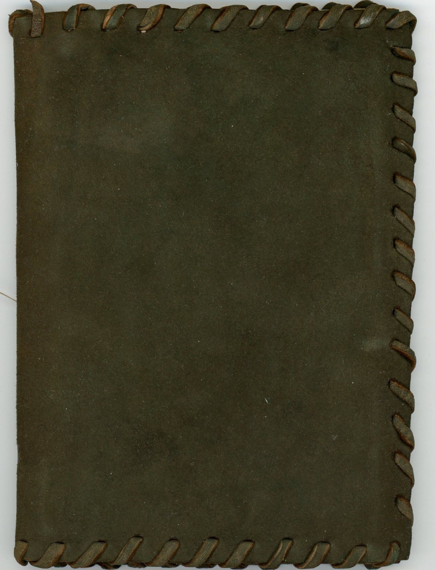 25 manuscript pages (of these 3 have in-text pen and ink drawings) and 4 full page color watercolors. Dark green suede covers with leather laced border decoration. Herringbone satin end papers. Measures 6" x 4 1/2