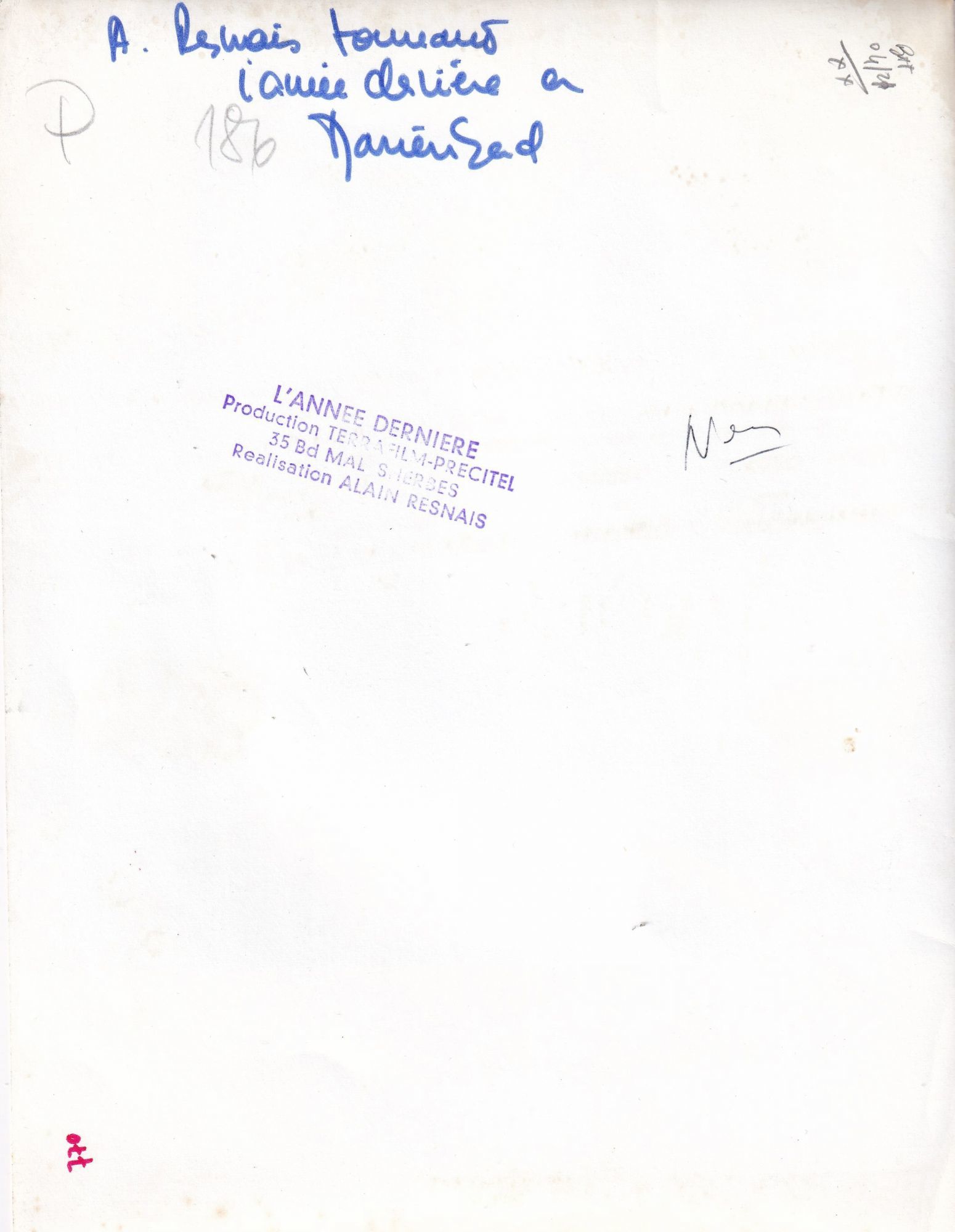 N.p.: N.p., 1961. Vintage borderless reference photograph of director Alain Resnais setting up a shot with a camera crew on the set of the 1961 French film. Stamp specific to the film's French release on the verso, along with manuscript ink and pencil annotations.