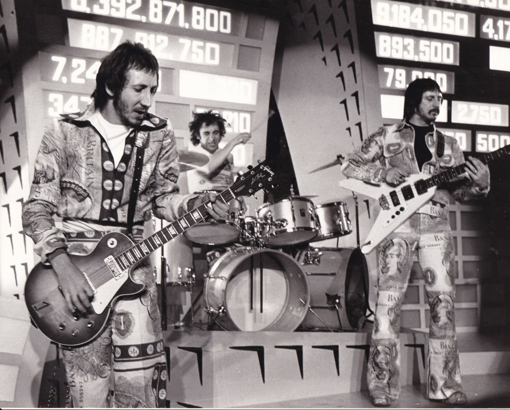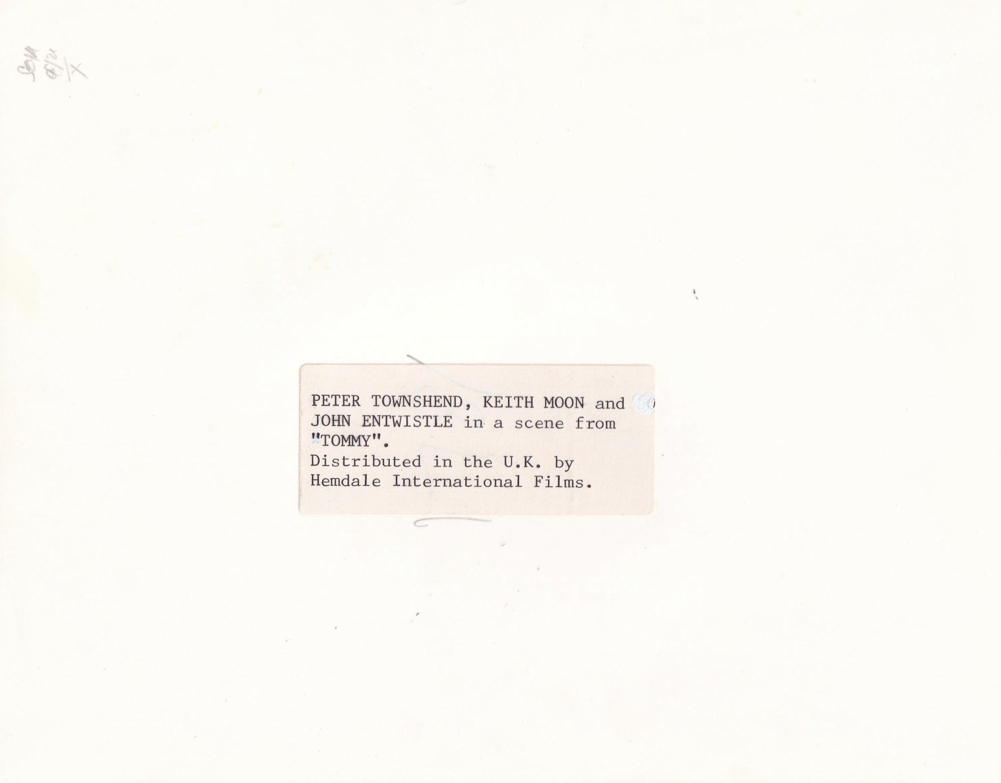 London: Hemdale International Films, 1975. Vintage borderless reference photograph of Pete Townshend, Keith Moon, and John Entwistle performing onstage in the 1975 film. Printed mimeo label affixed to the verso.
