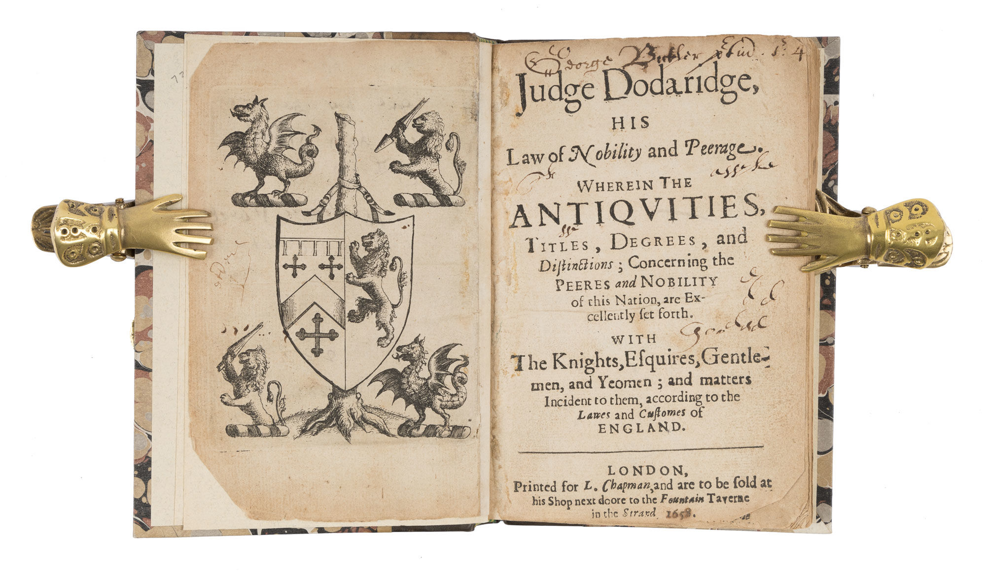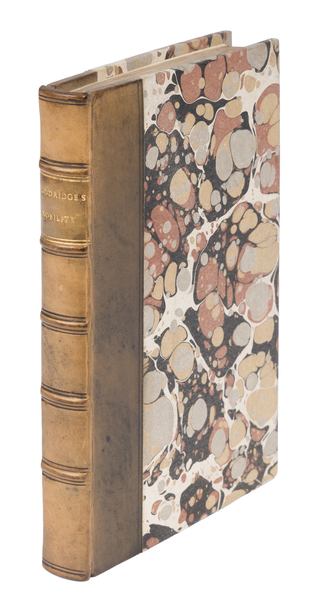 1658. London: Printed for L. Chapman, 1658.. London: Printed for L. Chapman, 1658. "Nobilitie of the Realme" [Bird, William]. Judge Dodaridge, His Law of Nobility and Peerage. Wherein the Antiquities, Titles, Degrees, And Distinctions; Concerning the Peeres and Nobility of this Nation, Are Excellently Set Forth. With the Knights, Esquires, Gentlemen, And Yeomen; And Matters Incident to Them, According to the Lawes and Customes of England. London: Printed for L. Chapman, 1658. [vi], 56, 65-114, 139-170, 105-158 pp. Pagination irregular. Lacking final leaf, a blank. Leaf with unidentified engraved copperplate coat of arms added before title page as frontispiece. Woodcut text illustrations of genealogical relationships. Octavo (6-1/4" x 4"). Modern period-style quarter calf over cloth, raised bands and lettering piece to spine, endpapers renewed. Moderate toning to text, occasional light foxing, faint dampstaining to a few leaves, moderate edgewear, doodles and early signatures to preliminaries (William Mealbank?, George Dublin, Thomas Theakston [dated 1682], Lawrance Gregge, Marmaduke Lowson) and final leaves of text, additional signatures of Thomas Theakston to several pages. $350. * Only edition, a revised and expanded version of Bird's Treatise of the Nobilitie of the Realme (1642). The occasion for this treatise was a contemporary controversy regarding the legitimacy of Edward Nevill's claim to the title of Lord Bergavenny. His claim is the starting point for a general review of peerage law. Another edition, with additions by Sir John Doddridge, was published later in 1642 as The Magazine of Honour; Or, A Treatise of the Severall Degrees of the Nobility of this Kingdome. Bird's 1658 edition draws on this work, which is why its title refers to Dodderidge and "his law." The frontispiece in our copy appears to be a later addition. It falls outside of the book's collation, is not called for in the ESTC record and does not match the copies listed on OCLC. OCLC locates 7 copies in North American law libraries (Columbia, Harvard, Library of Congress, Nova Scotia Legislative Library, University of Cincinnati, University of Minnesota, University of Pennsylvania). English Short-Title Catalogue R11125.
