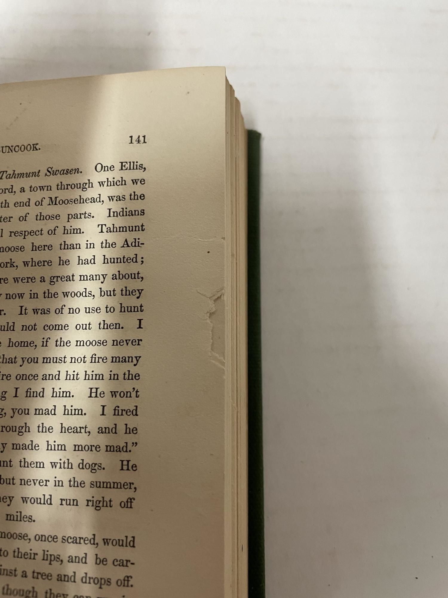 Boston: Ticknor and Fields, 1864. First Edition. 12mo., 304 pages plus appendix and publisher's advertisement; VG-; Rebound in green cloth with original dark green spine laid down, slightly faded gilt lettering within wreath ornament; Minimal shelfwear to boards and corners; Faint scratch to textblock fore-edge, small chips to pages 141-144, and a small faint damp-stain at top edge that is visible on interior pages from roughly p. 200 - end; Ex Libris of former owner on front pastedown; CX consignment; shelved case 10. BAL 20113. 1346128. Shelved Dupont Bookstore.