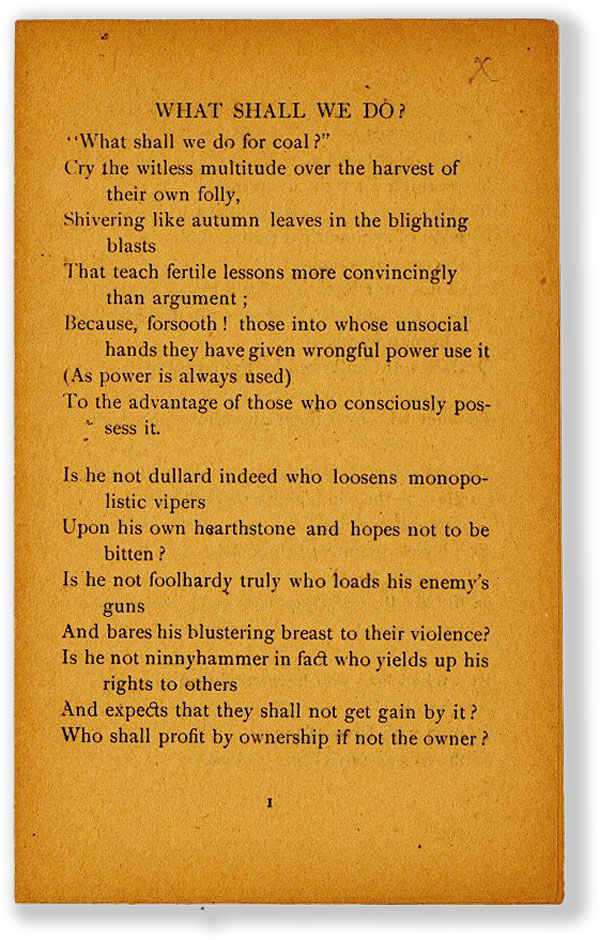 N.p., n.d. [Detroit: Labadie Shop, ca 1902]. 4-pp leaflet, 14cm x 9cm. Printed in black on newsprint. Paper somewhat age-darkened, but still supple and well-preserved; Good to Very Good.