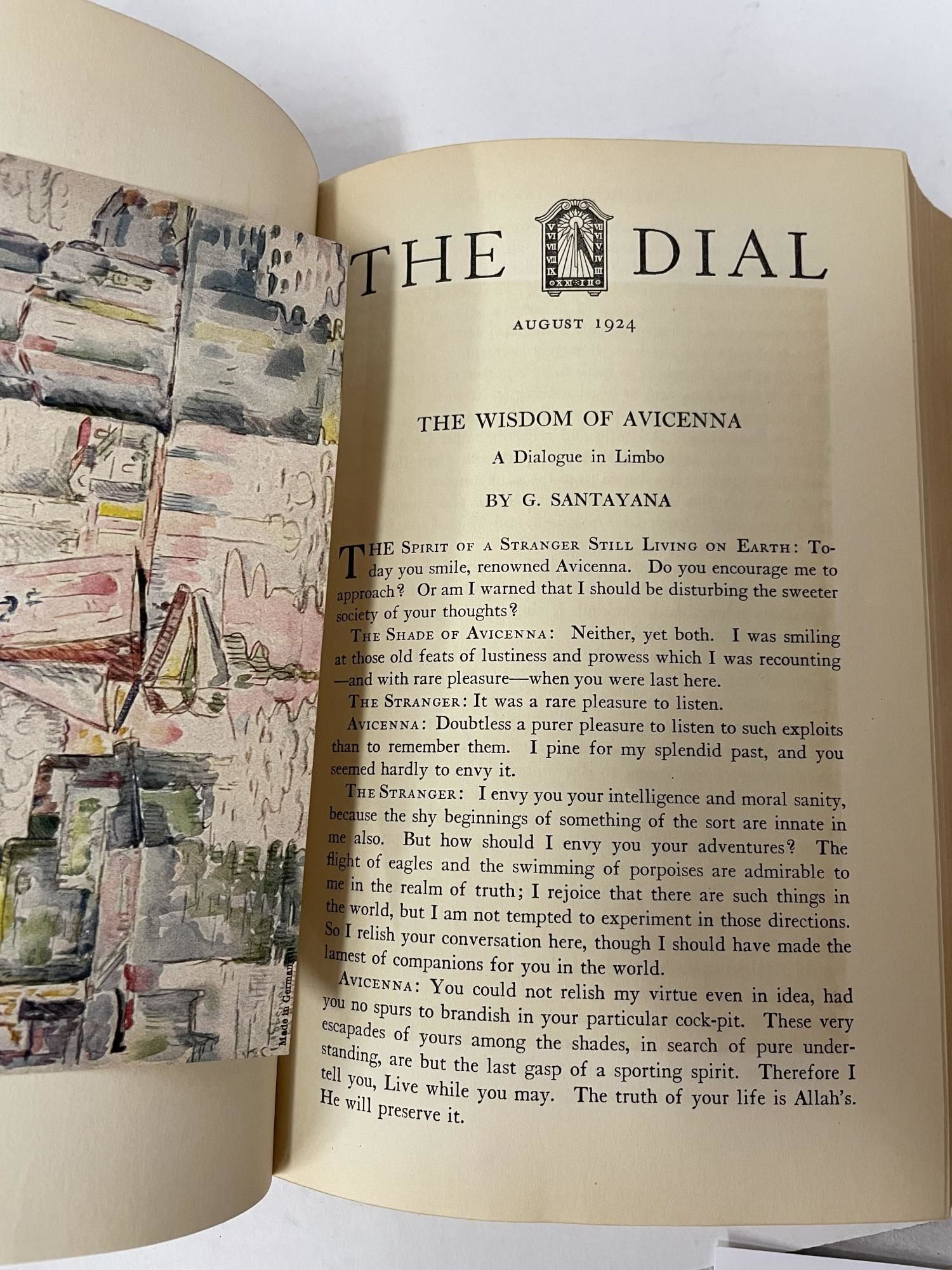Camden: The Dial Publishing Company, 1924. First edition. Hardcover. Octavo, xii, 540 pages; G; Reddish brown leather spine with raised bands and gilt lettering; Front cover has largely split from the spine (but still bound at the bands), moderate wear at corners and edges, mild rubbing on raised bands of spine, a crease along the joint of back cover, and the leather at head of spine is chipped; Mild age-toning at edges and on pages opposite mounted plates; 3/4 leather-bound with marbled boards; Illustrated; Bookplate of R.H. Titherington pasted on front pastedown; CX consignment; NOTE: Shelved in Room G. A compendium of the the six monthly editions of literary publication "The Dial " issued between July and December of 1924.