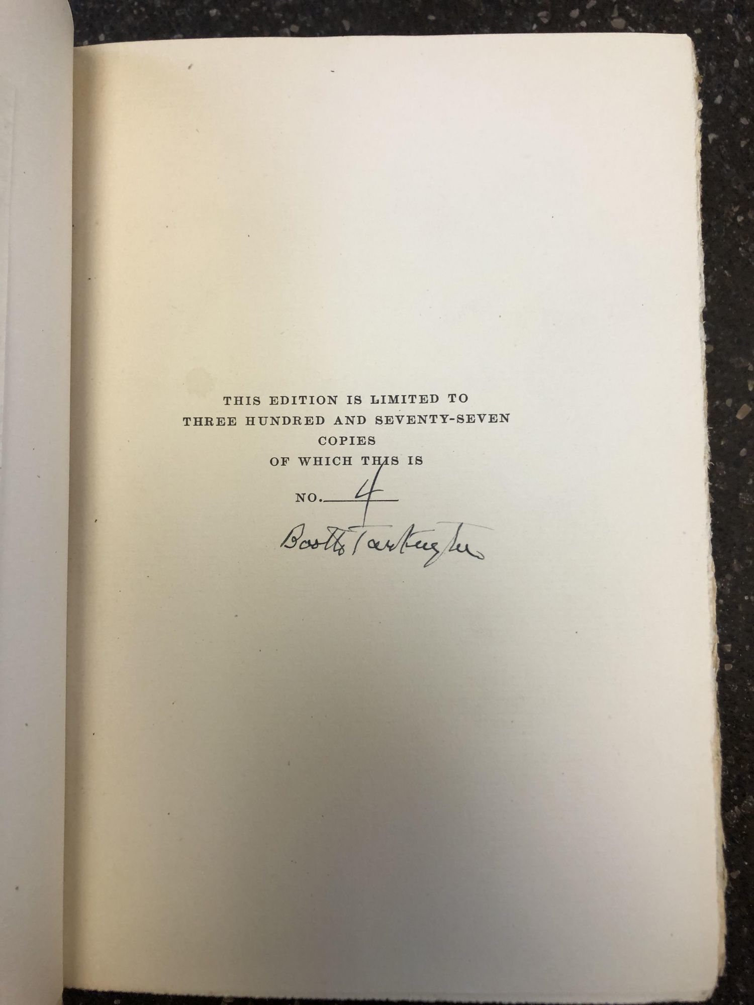 Garden City, NY: Doubleday, Page & Company, 1923. Limited Edition, #4/377. Hardcover. Octavo, 492 pages; VG/VG-; in G+ blue slipcase; spine age-toned light blue, with black lettering; mild shelf wear and soiling; slipcase starting at top edges; tide line to head of jacket spine; upper edges of textblock bright gilt; catalog listing tipped in at front pastedown; signed flat by Tarkington at limitations page; hand-numbered #4 at limitations page; pages uncut; CX consignment; shelved on bookshelves to the left of the copier. 1346289. FP New Rockville Stock.