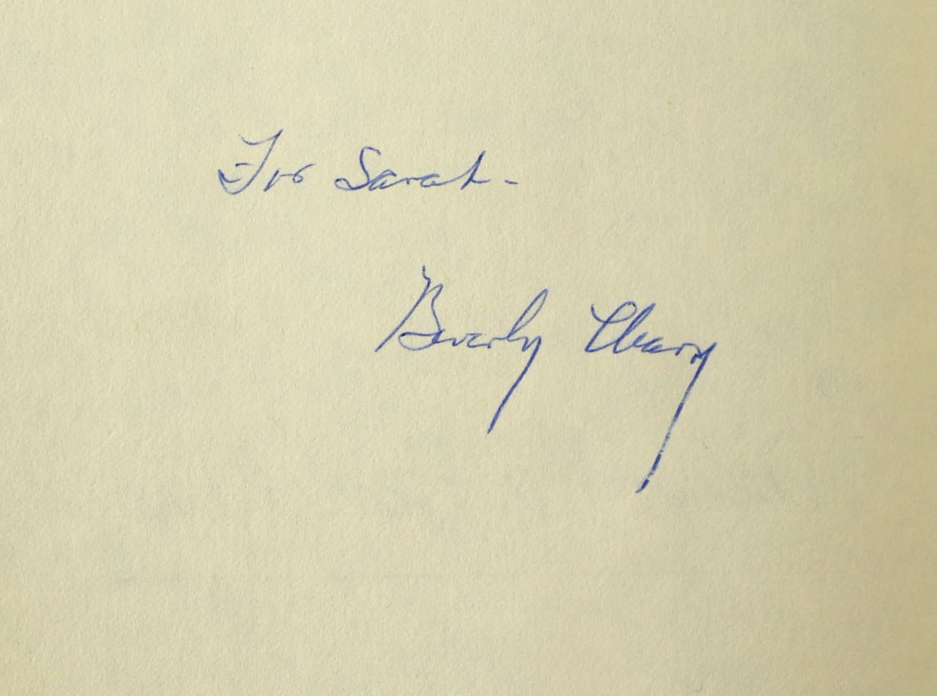 New York: William Morrow and Company, Inc, 1983. Fifth Printing. Hard Cover. Very Good binding/Very Good dust jacket. Signed. 8vo,; in the publisher's white cloth over blue paper-covered boards with dustjacket; there is some spotting to the front endpaper; this copy of the Newbery Medal-winning young adult novel is signed by Beverly Cleary "For Sarah, Beverly Cleary" on the verso of the half-title page. There is some light spotting to the endpaper, and two small spots of wear to the bottom edge of the paper-covered boards.~~The gold Newbery Medal Award seal is on the front panel of the jacket; there is no price on the dustjacket flap. Very Good binding / Very Good dust jacket.
