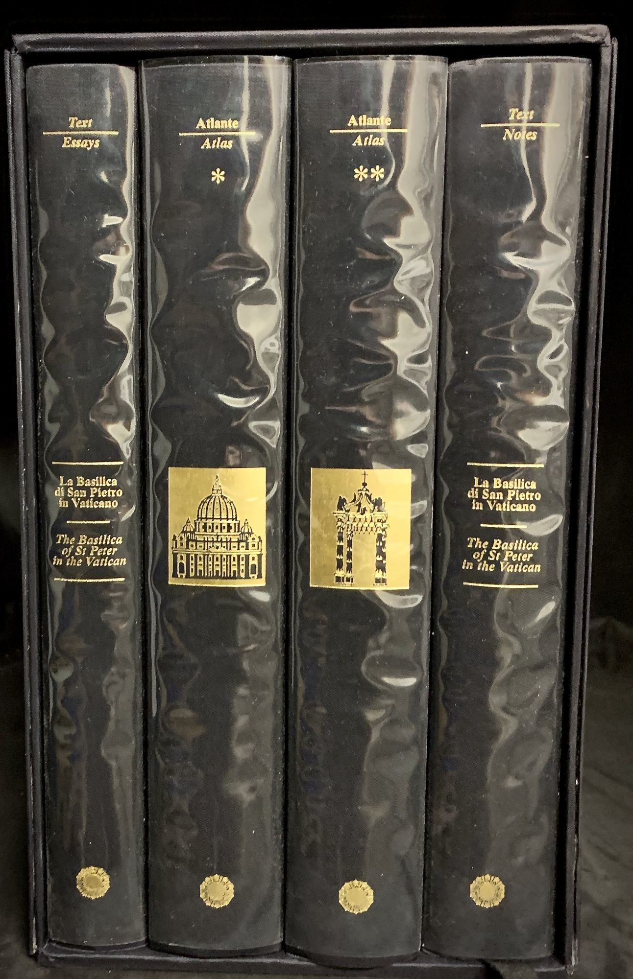 Modena: Franco Cosimo Panini, 2000. First edition. Hardcover. Orig. black cloth. Fine in fine matching decorated slipcase. 4 vols. A total of 2287 pages. 30.5 x 25.5 cm. Two Atlas volumes, one Text and one Essay volume. Elegantly printed on glossy stock with text in English and Italian. Atlas volume with black and white and color plates (photographs) providing topographical sequence in detail. Text volume with critical commentary by scholars, and Essay volume presents a historical narrative to alterations and examines the architectural monuments in the perspective of time. There are cross references to facilitate the text and essays to the images. Elegantly bound in black cloth with gilt cover and spine designs, all in clear mylar slipcases.