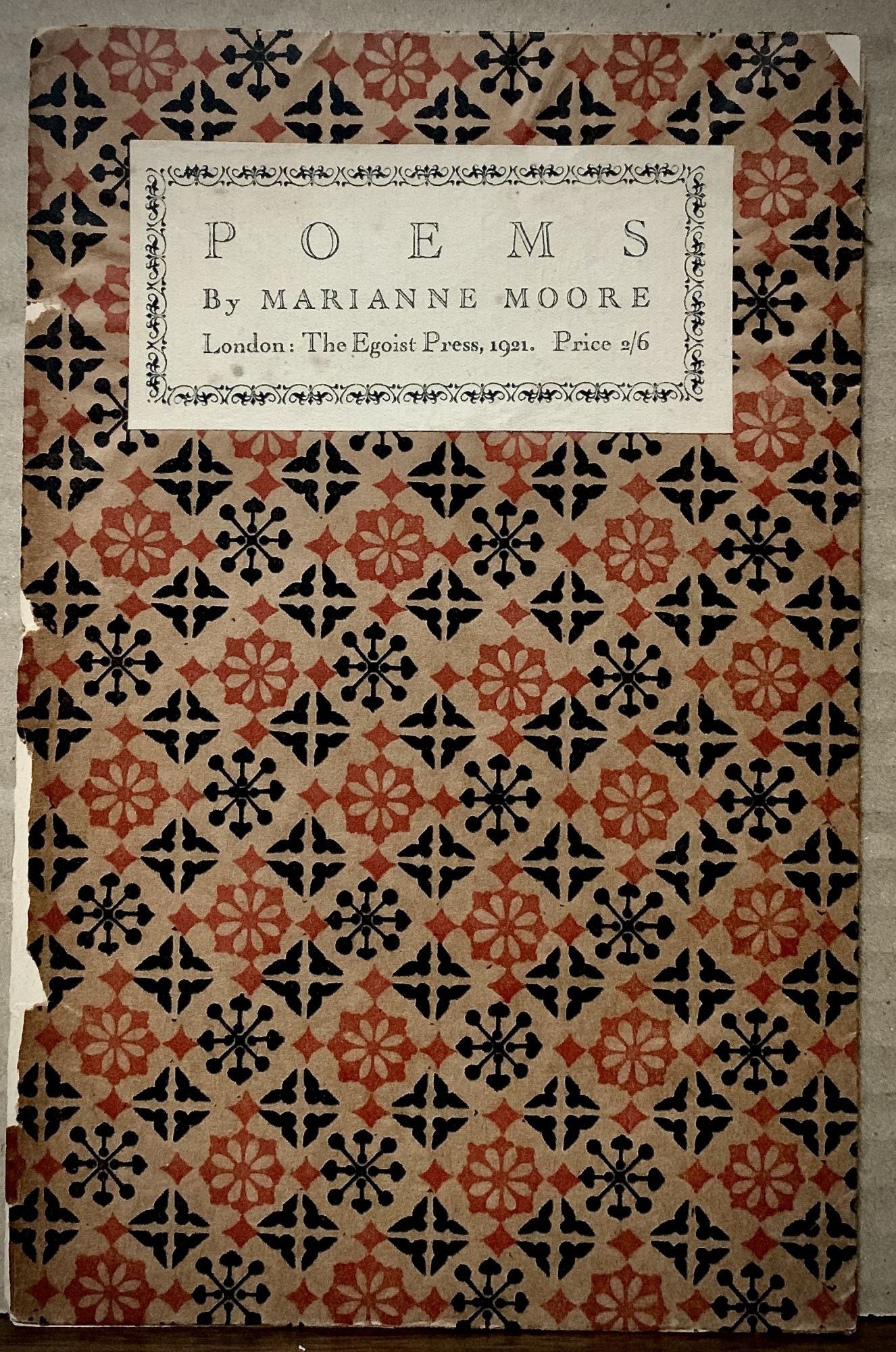 London: Egoist Press, 1921. First edition. Stiff Wraps. Orig. patterned paper stiff boards, front cover paper label. Very good. 24 pages. 21.5 x 14 cm. Moore's first book, Poems, was published without her permission in 1921 by the Imagist poet H.D. and H.D.'s partner, the British novelist Bryher. She carried on a correspondence with Joseph Cornell from 1943 through 1961 whose methods of collecting and appropriation was much like her own. Clean copy, slight loss front cover lower backstrip margin with similar defect at back cover margin. ABBOTT A1. CONNOLLY 100.