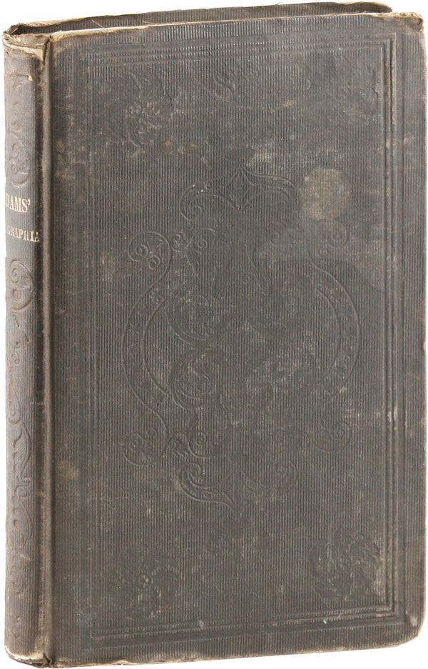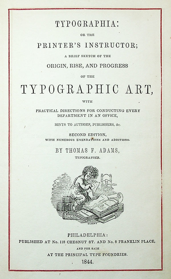 Philadelphia: At No. 118 Chesnut St and No. 8 Franklin Place, 1844. Stated second edition. 12mo (20cm). In brown cloth, blindstamped, and titled in gilt on spine; yellow coated endpapers; [i]-vi [7] 8-282, [5]pp; ad for Adams' "Printers' Furnishing Warehouse" at rear; illustrated with in-text wood engravings, including several pictures of presses, diagrams of different lays of the case, and 50pp of format diagrams. Pencil inscriptions to front flyleaf and rear pastedown of Carlos Smith, 1851, with newspaper clippings about printing laid down on rear board. A straight copy, rubbed at edges, with minor losses at head and tail; endpapers dirty; two gatherings pulled, but holding; occasional spots of foxing: complete, Good, and sound. Adams borrowed heavily from previously published printers' manuals, including John Johnson's Typographia (London, 1824).