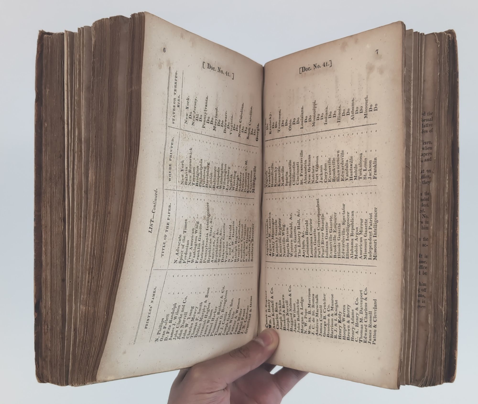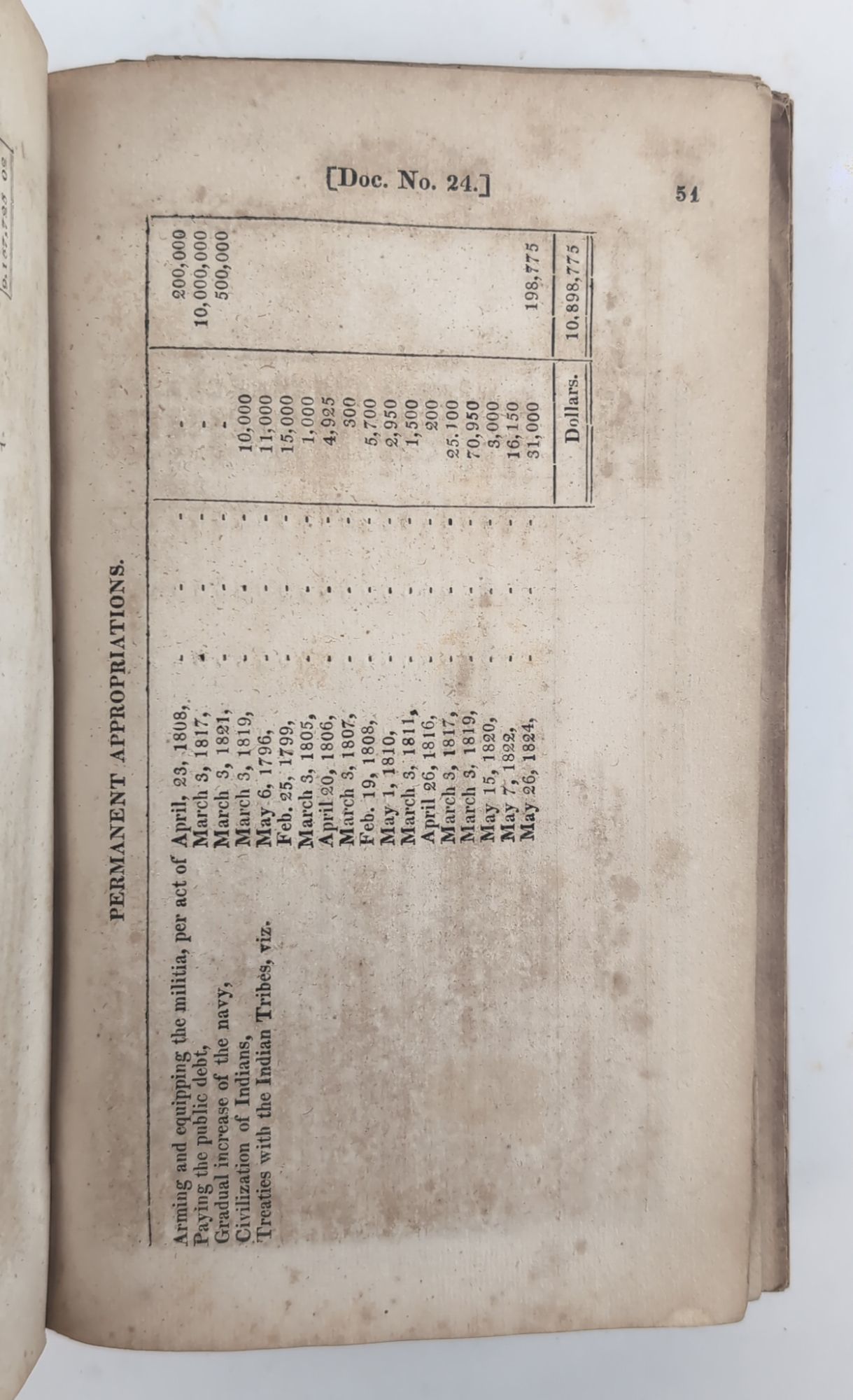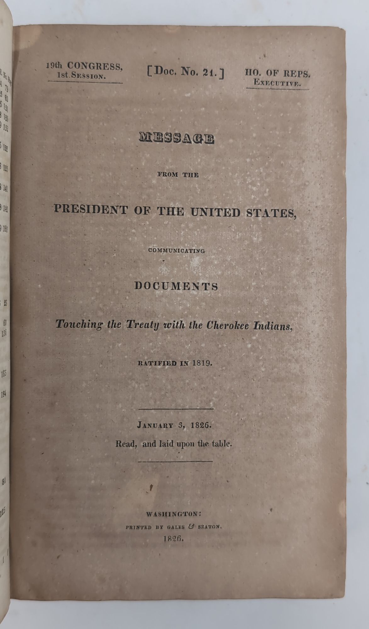 Washington, D.C.: Gales & Seaton, 1826. First Edition. Hardcover. Octavo, 29 parts. In Good condition. Bound in full contemporary brown leather, label missing from spine; Boards show substantial wear to all edges and surfaces, the front cover has split along the joint (but still attached/intact), chipping at the head/tail of spine, and leather rust overall; Text block has varying degrees of age-toning throughout, and sporadic foxing; nameplate of former owner appears on front paste-down; mild foxing throughout; includes 41 fold-out plates, as issued, with some foxing; Shelved in Room G. 1346778. Special Collections.